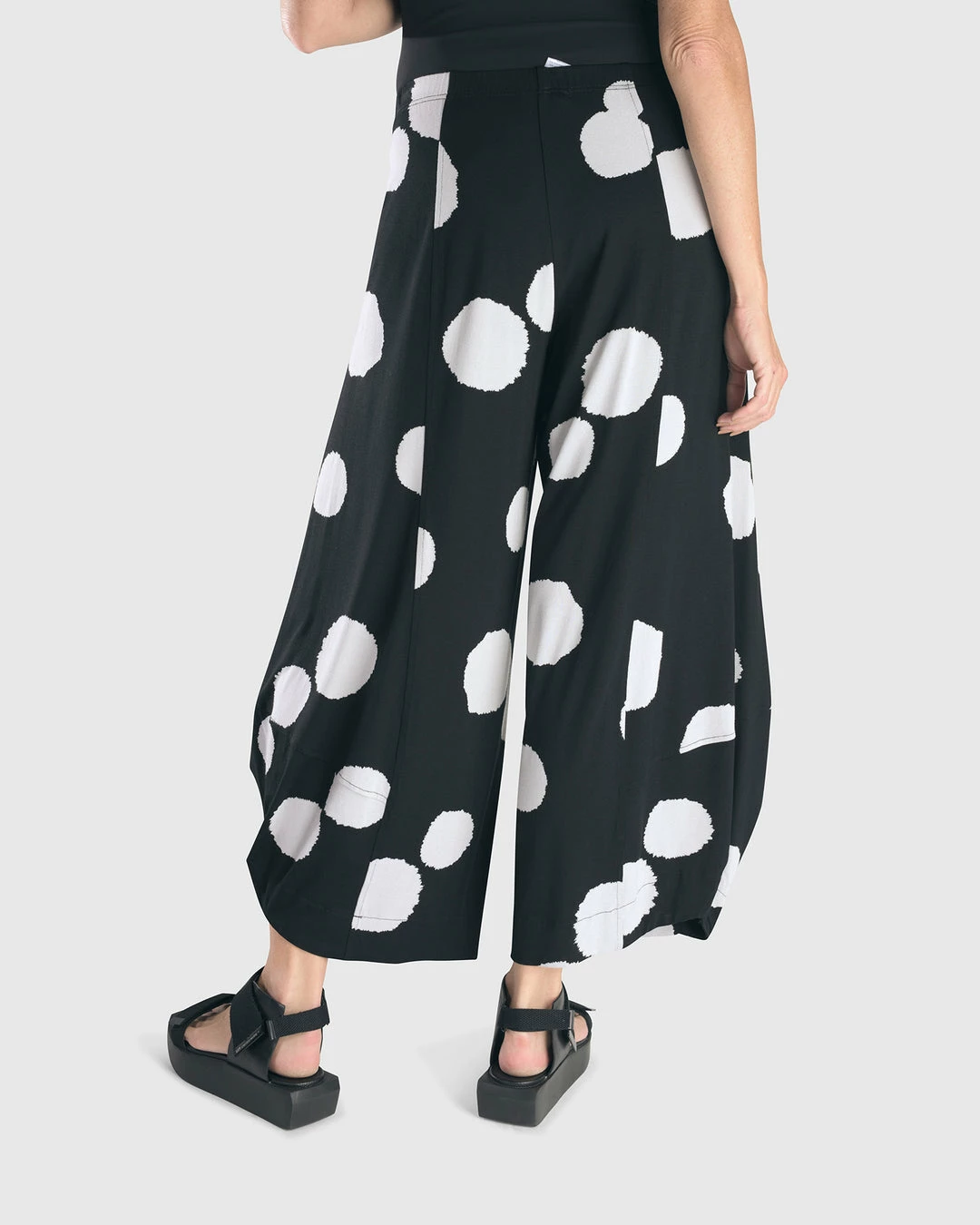 An Alembika favorite and signature silhouette, the punto pant style has seam detail ballooned legs with faux fly detail at elastic stretch pull on waist. In a jersey knit of bold large distressed dots, these are comfortable and chic, perfect to mix and match with coordinating tops.