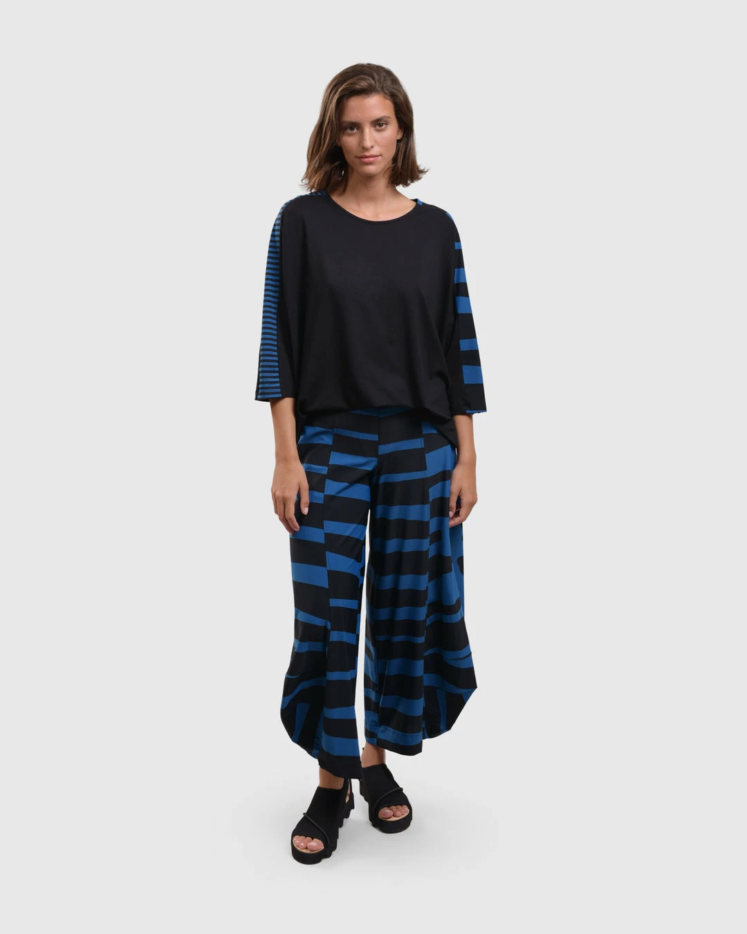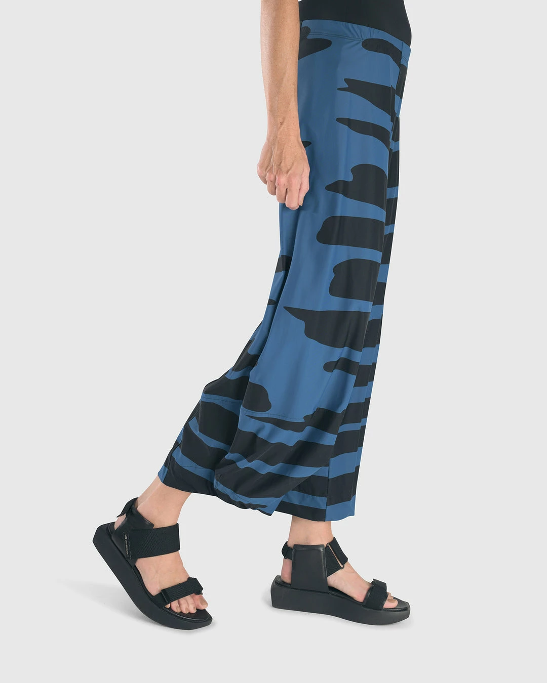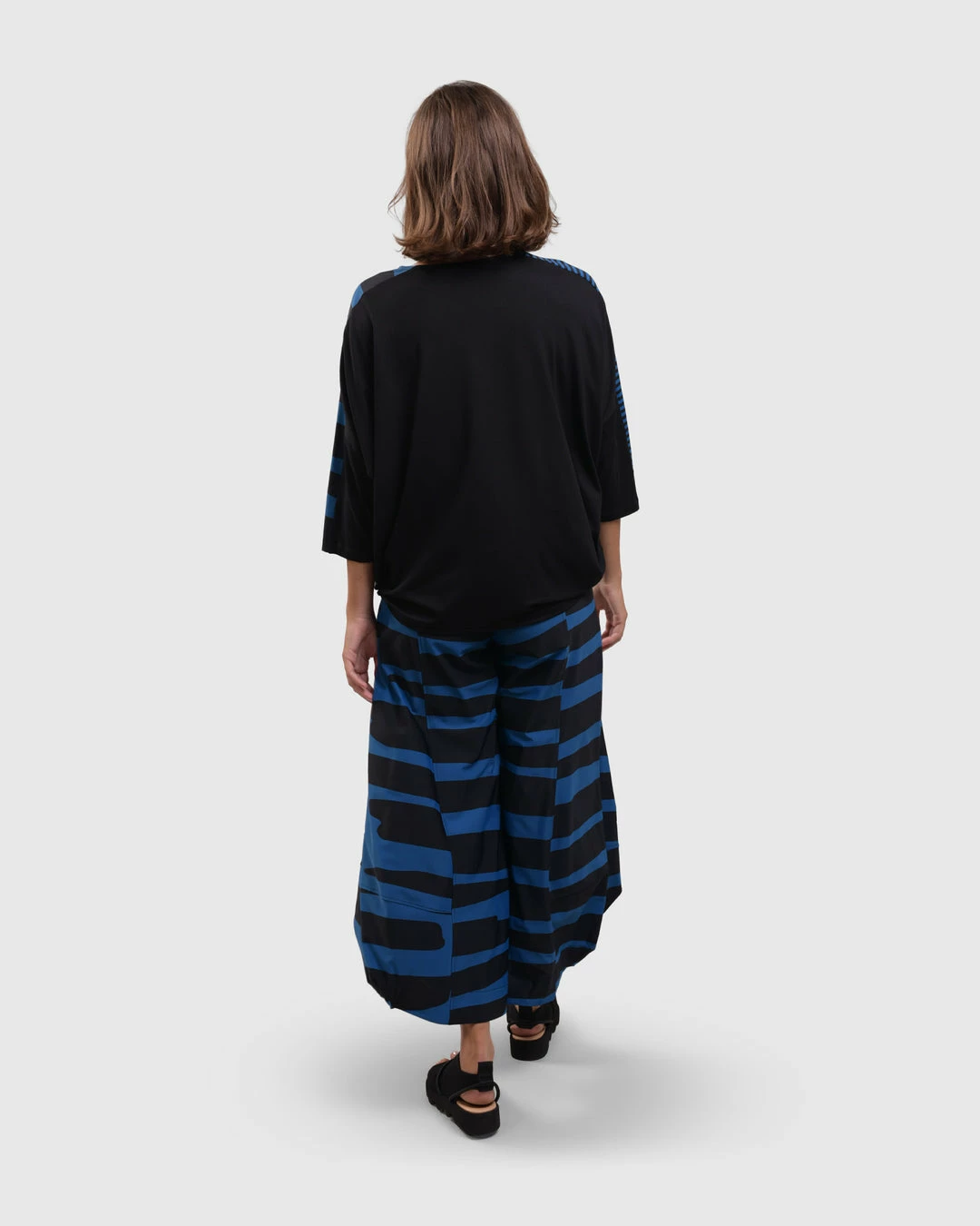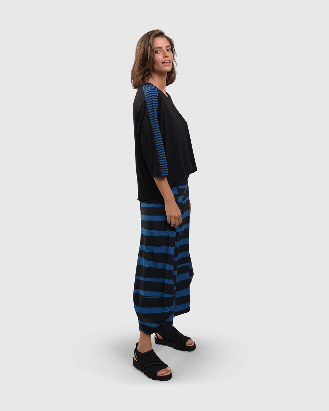 An Alembika favorite and signature silhouette, the punto pant style has seam detail ballooned legs with faux fly detail at elastic stretch pull on waist. In a bold striped print in signature Tekbika fabric.