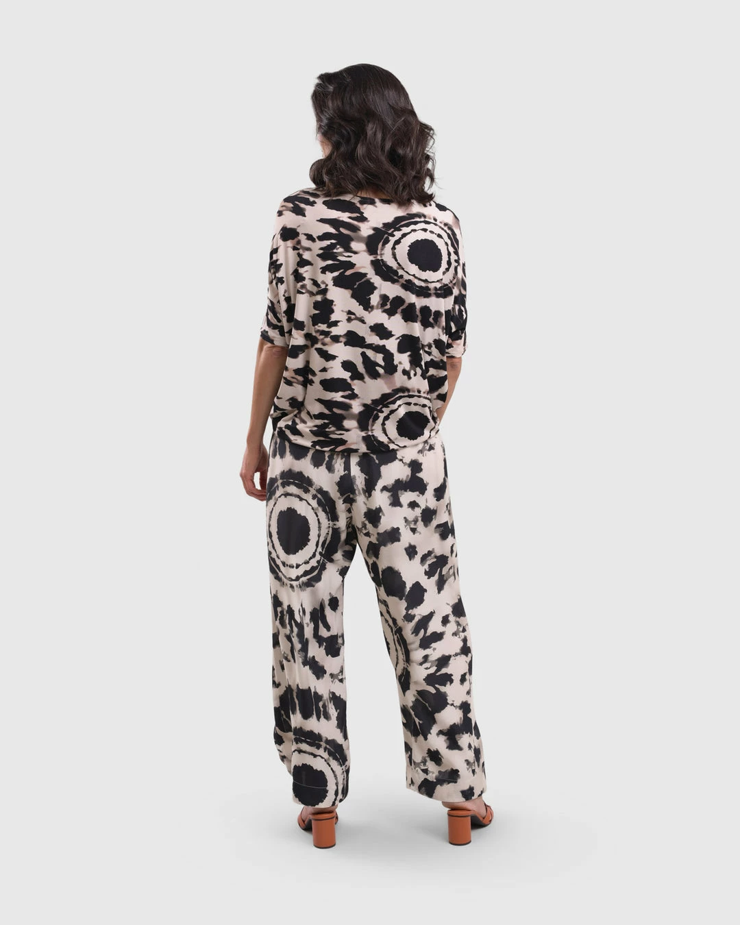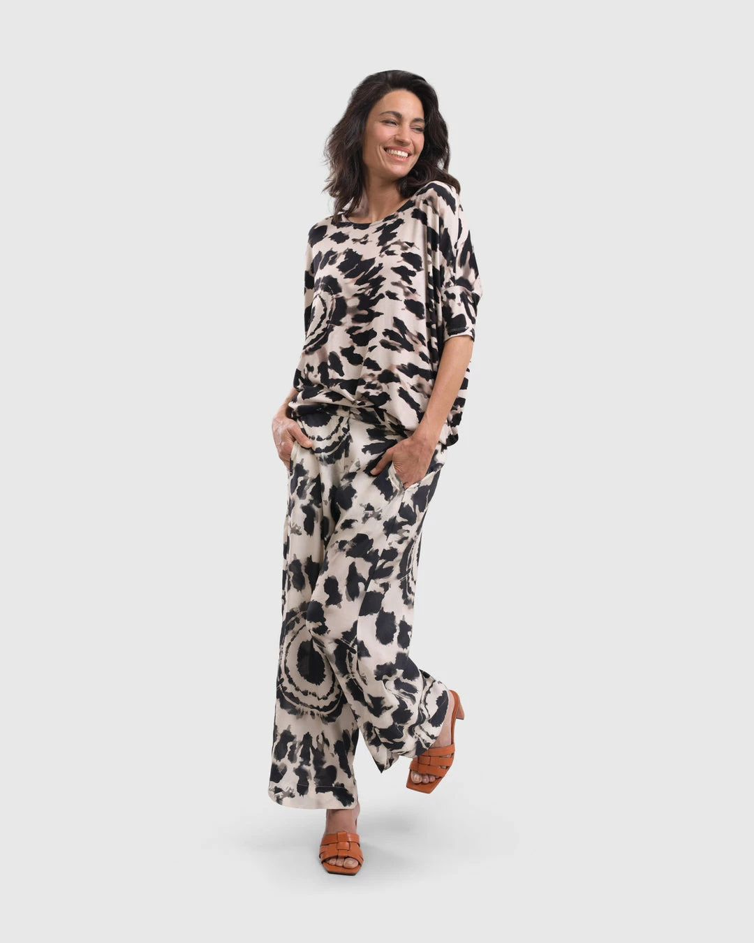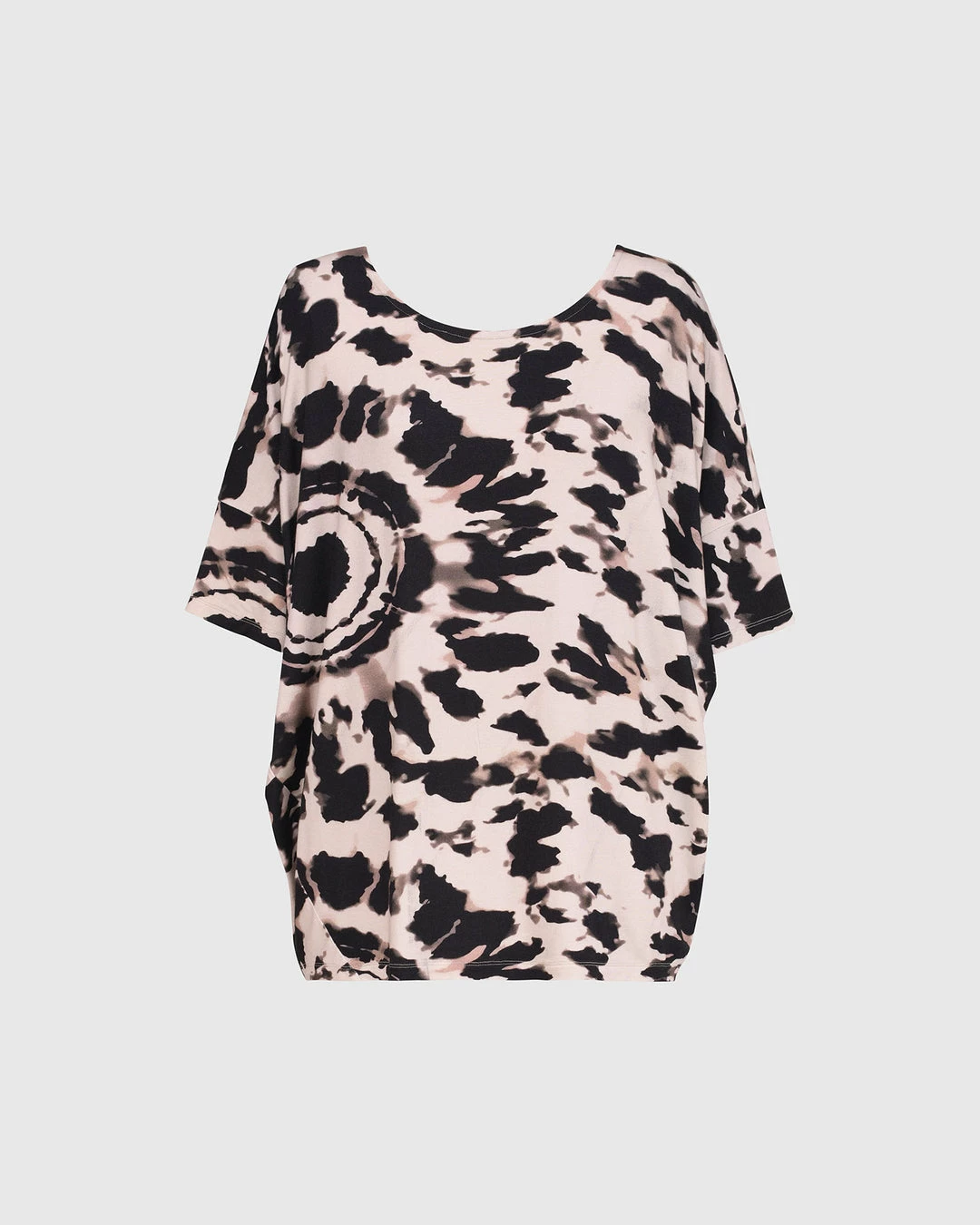 A favorite silhouette from Alembika, this relaxed top has a roomy body that tapers to hemline, creating a side drape. It’s finished with a round neckline and short dropped sleeves. In a buttery soft tribal tie dye printed knit, it’s effortless and chic.