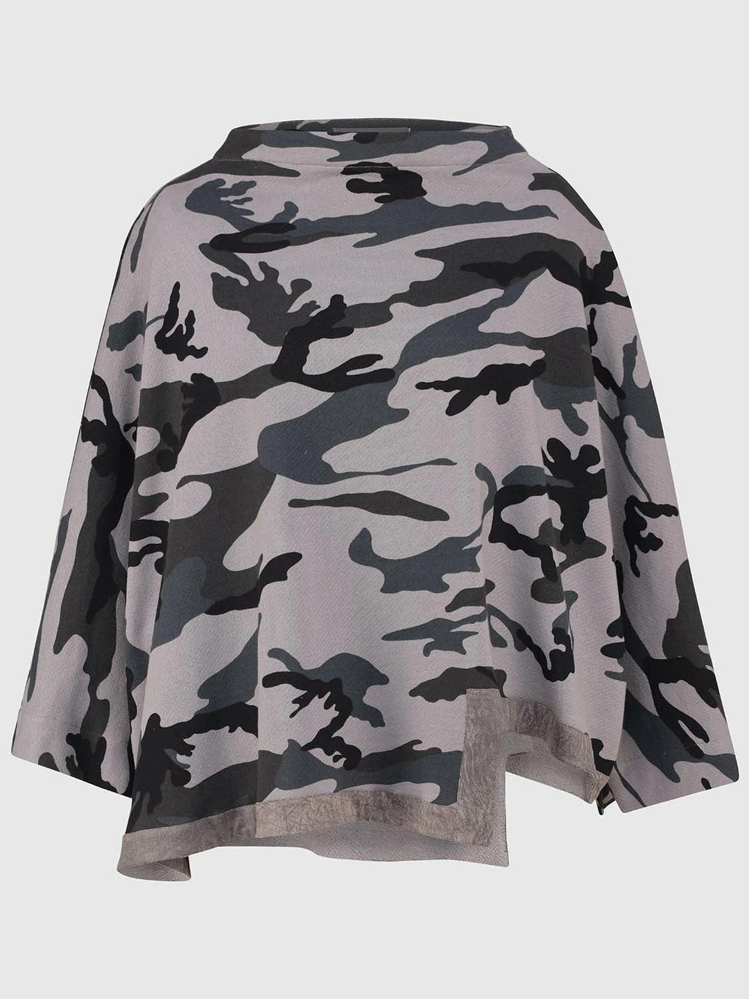 This cozy top has an all-over camo print, trimmed at hemline with a faux leather print accent. The oversized boxy body has a funnel neckline, dolman set sleeves and a stepped high low hemline.