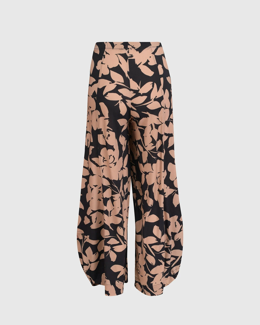 An Alembika favorite and signature silhouette, the punto pant style has seam detail ballooned legs with faux fly detail at elastic stretch pull on waist. In a silhouette floral leaf tan and black print stretch jersey knit, these are comfortable and chic.