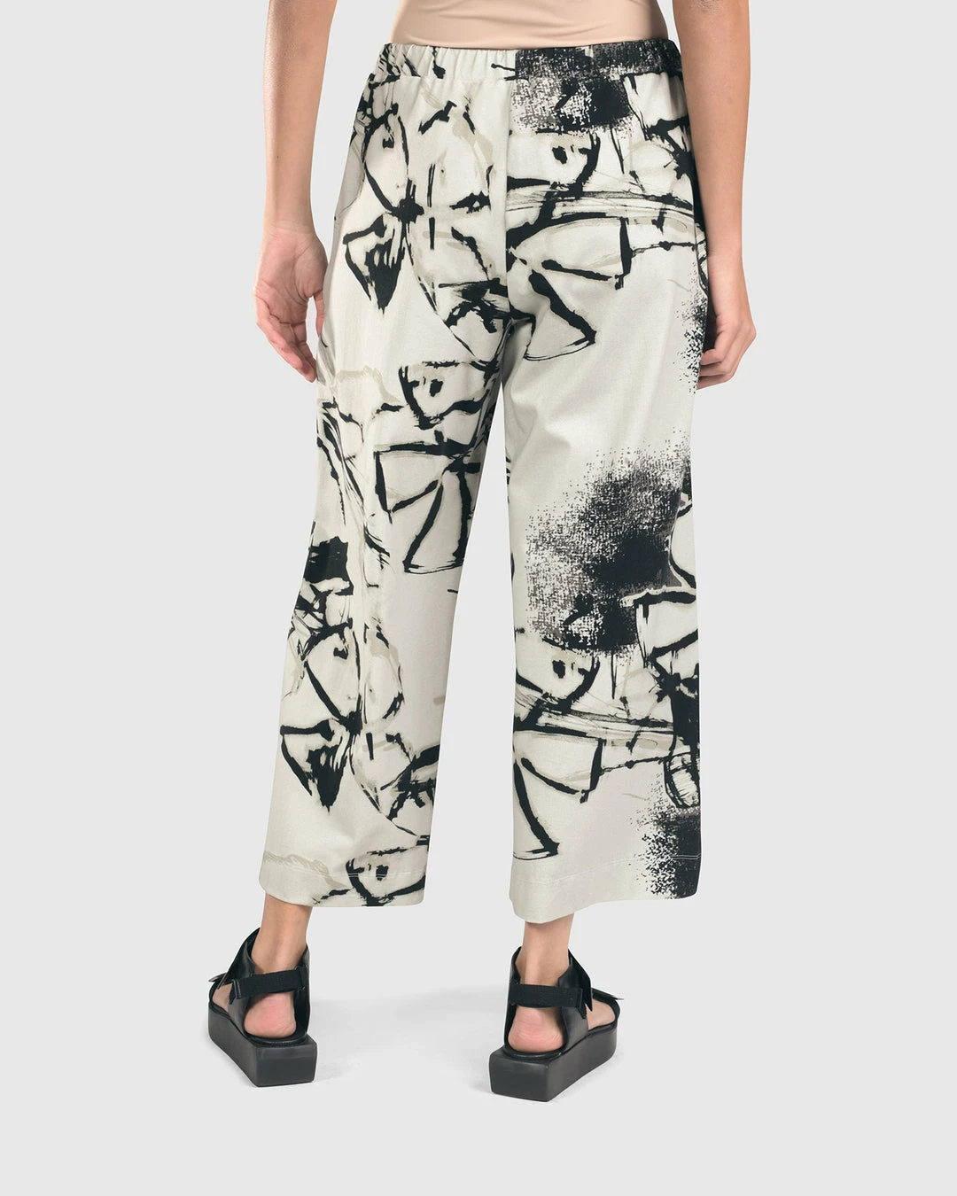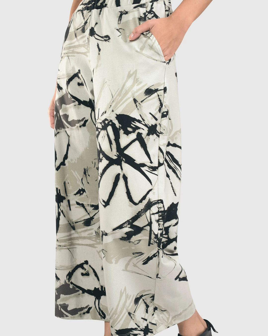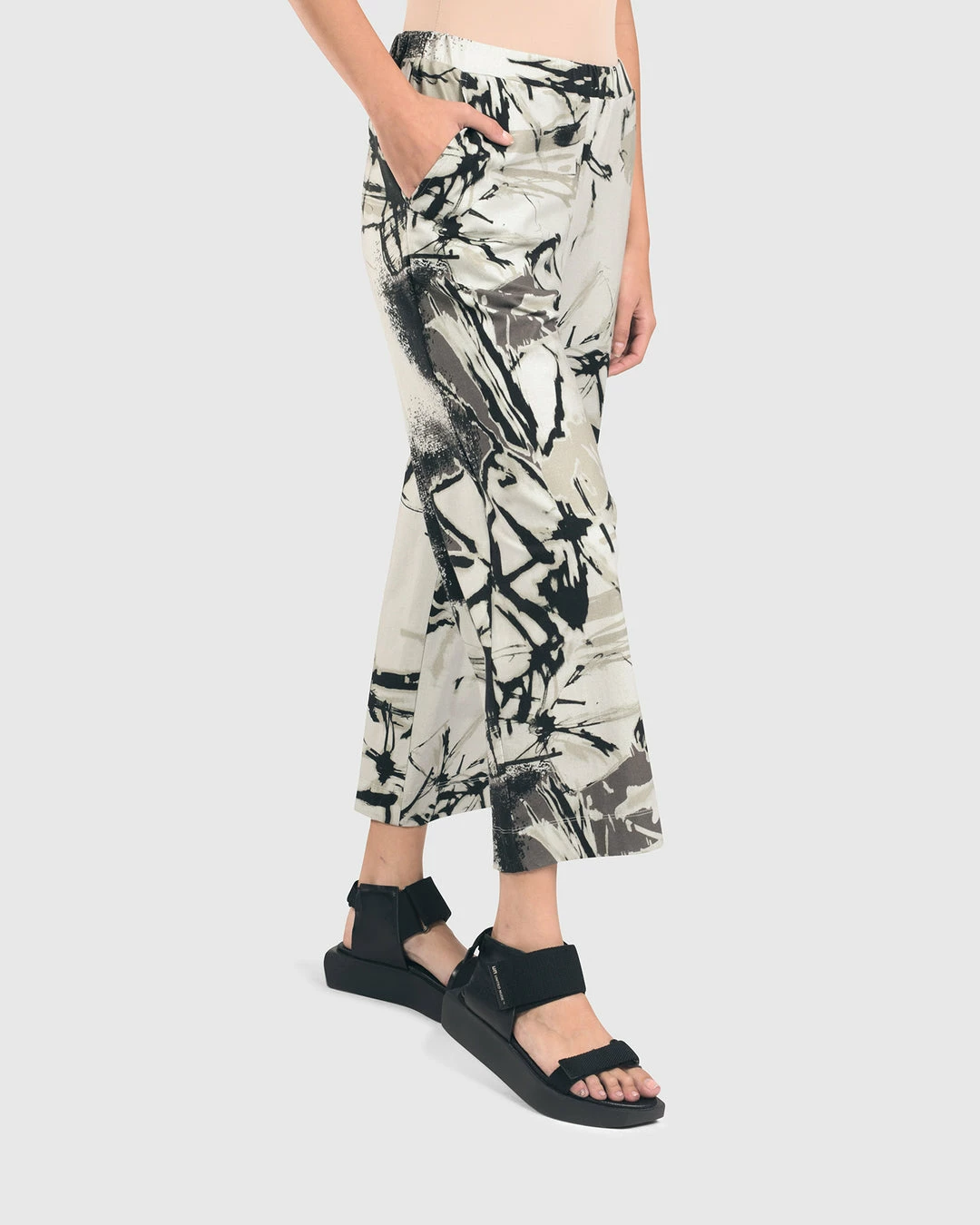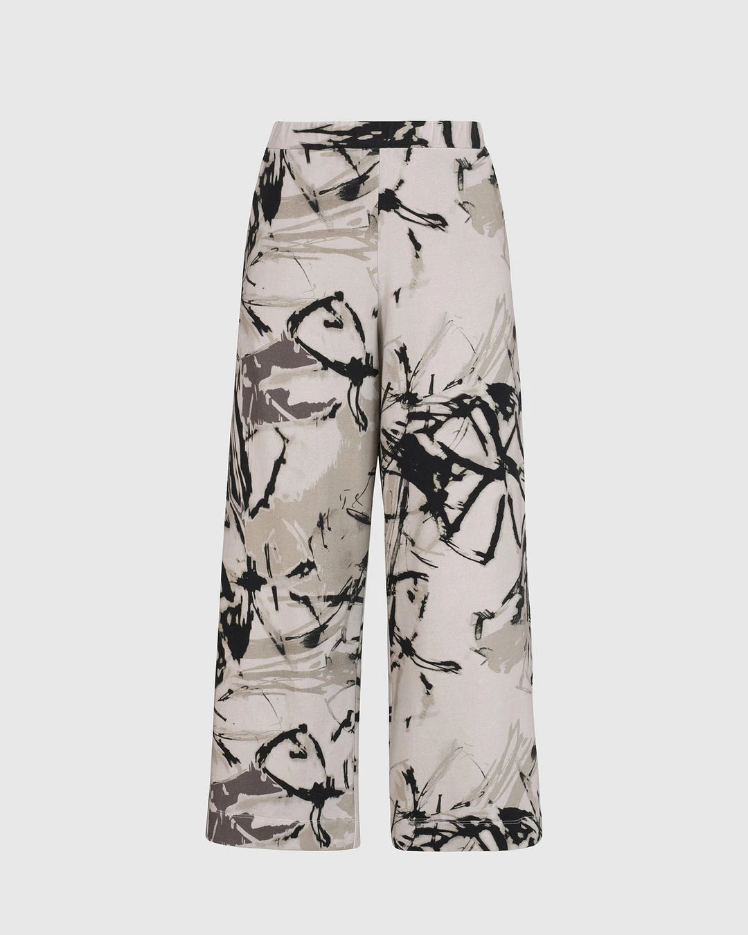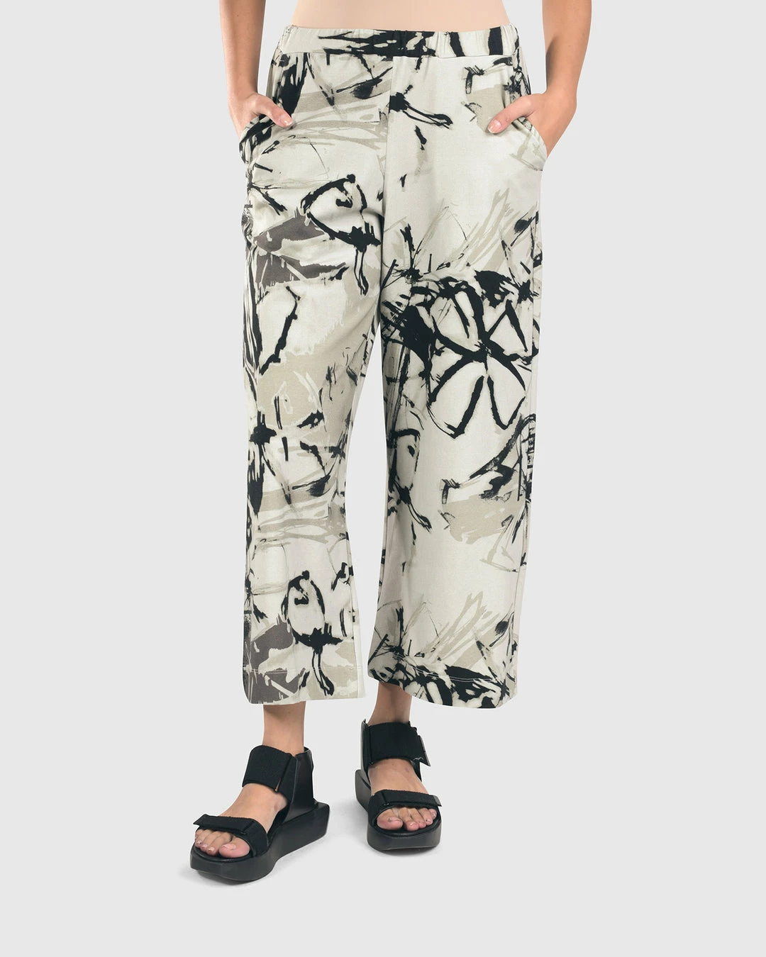 This easy cropped pant has wide straight legs with an elasticized pull on waist with side seam pockets.