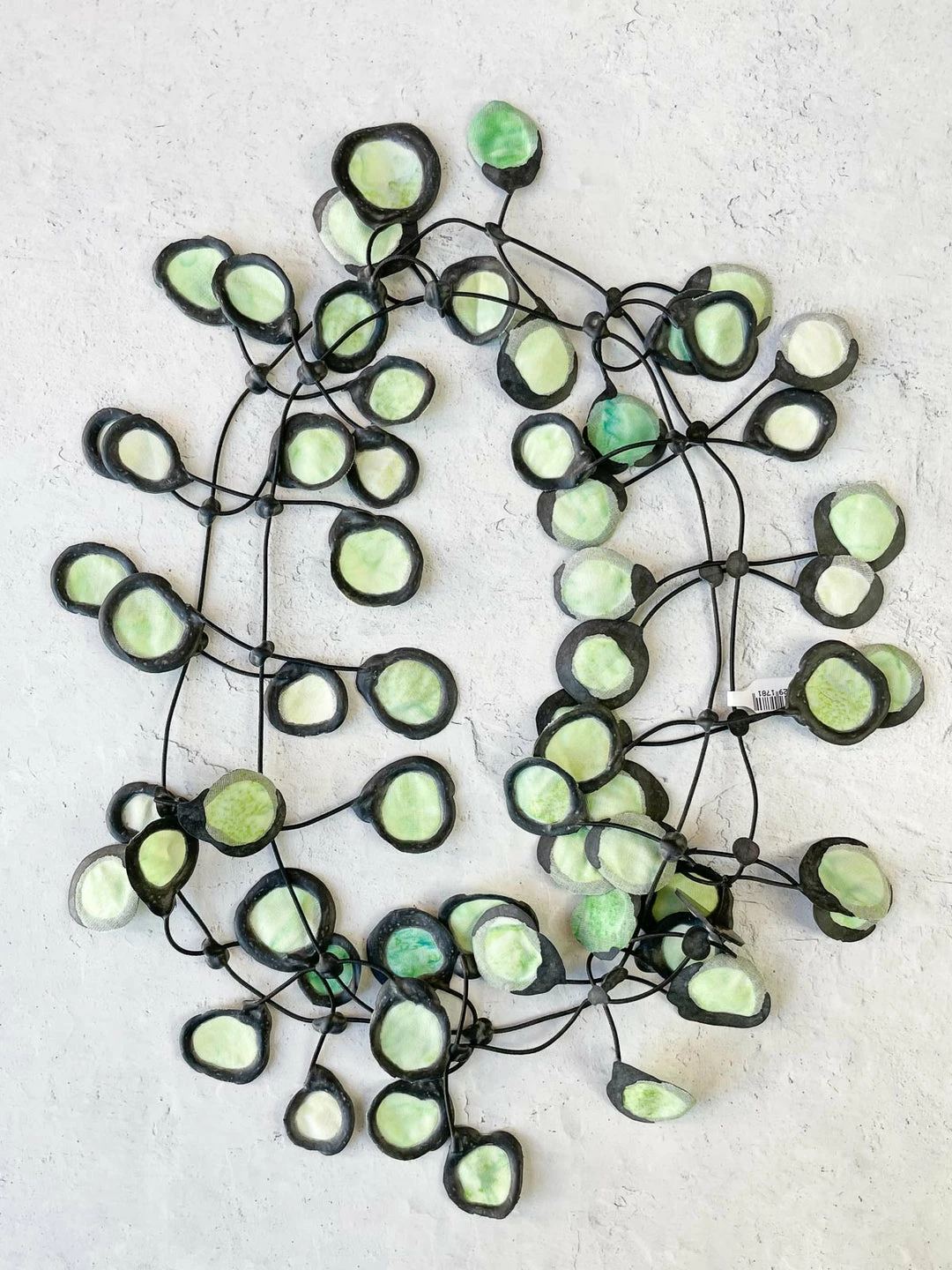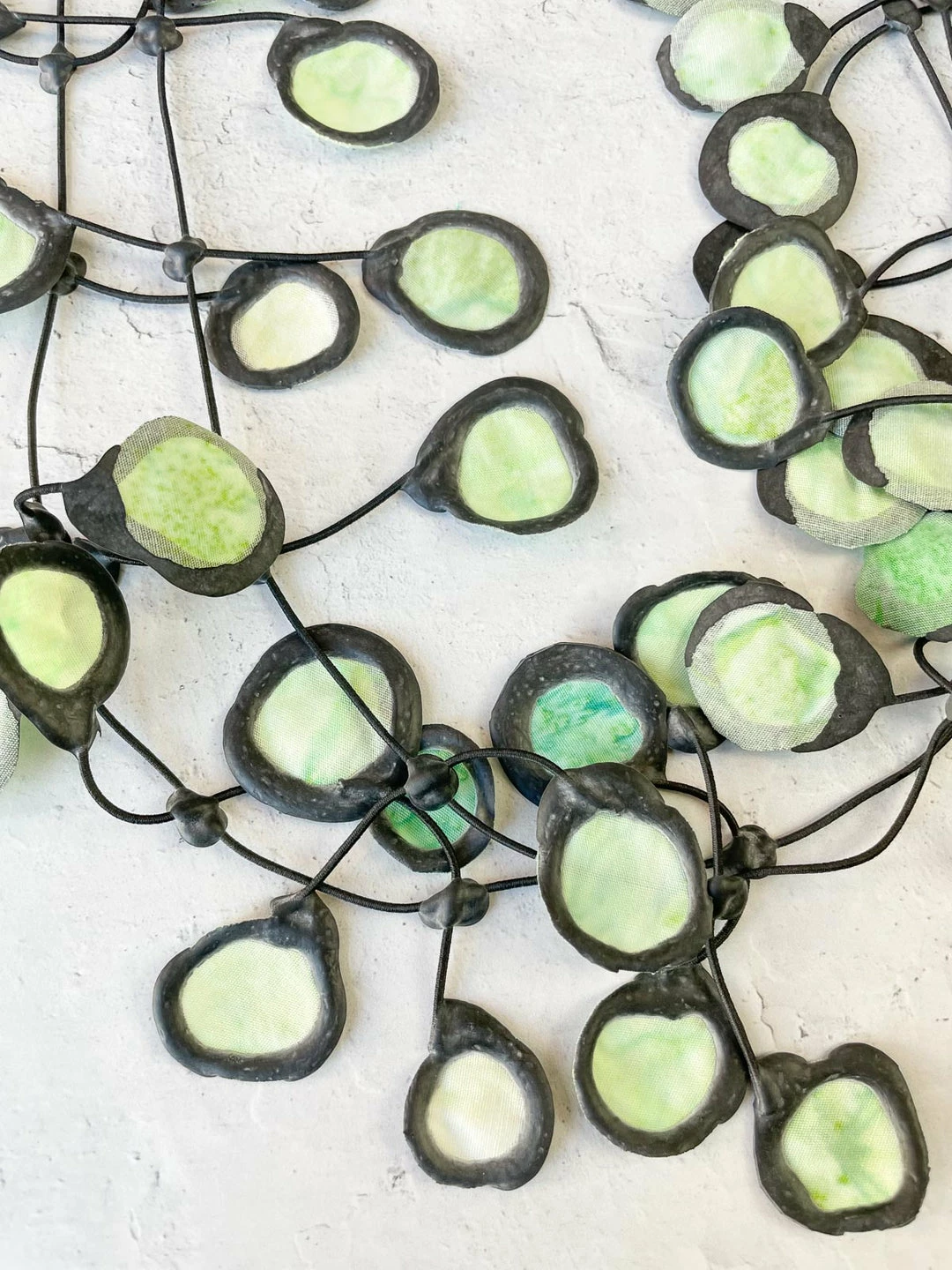 Large batik fabric “petals” are trimmed in black rubber and tied along thin black stretch cord. Wear long, doubled up or tripled as a collar – even wrap around the wrist as a bracelet! Have fun layering multiple styles and colors to create a truly unique look!