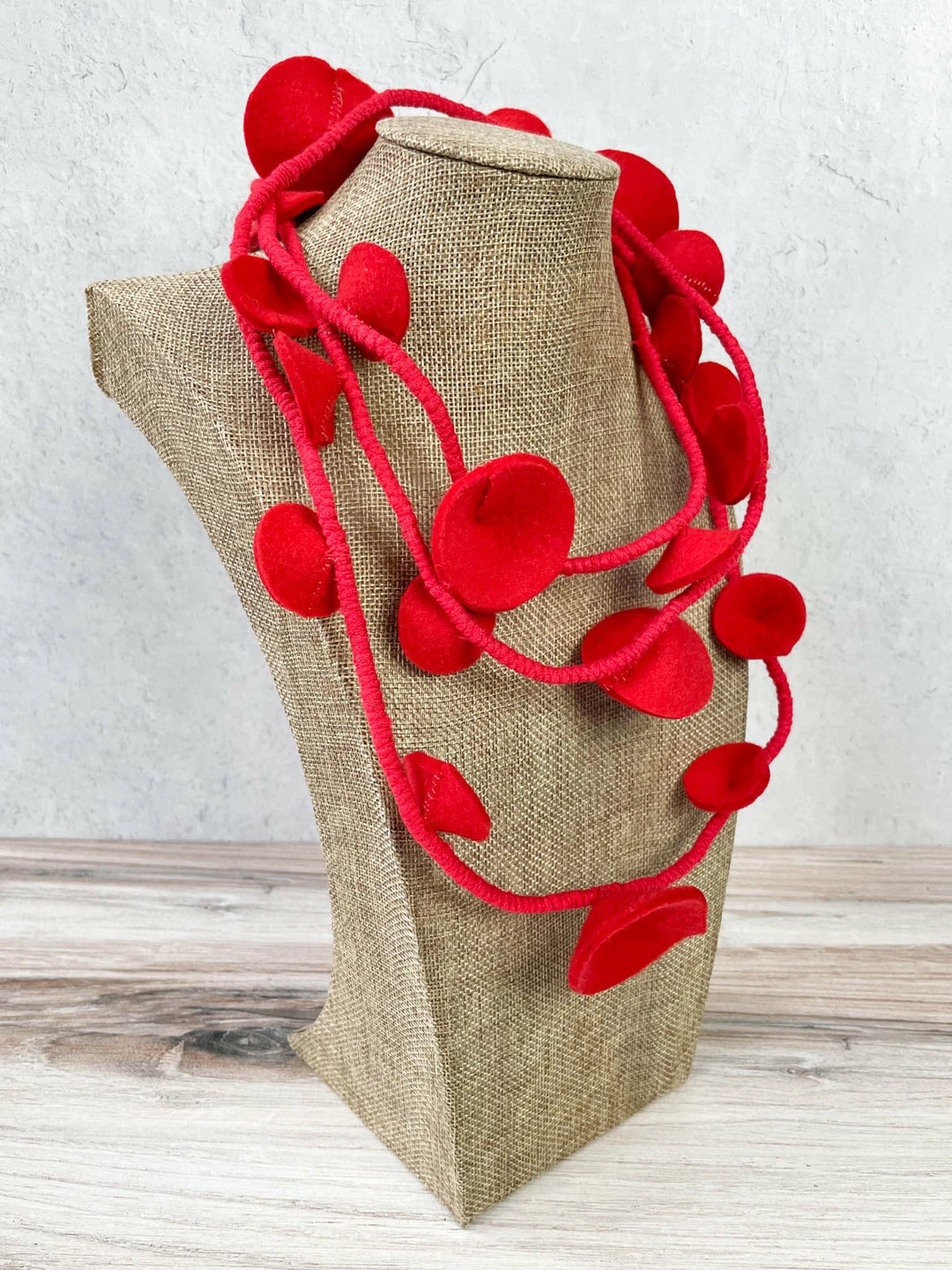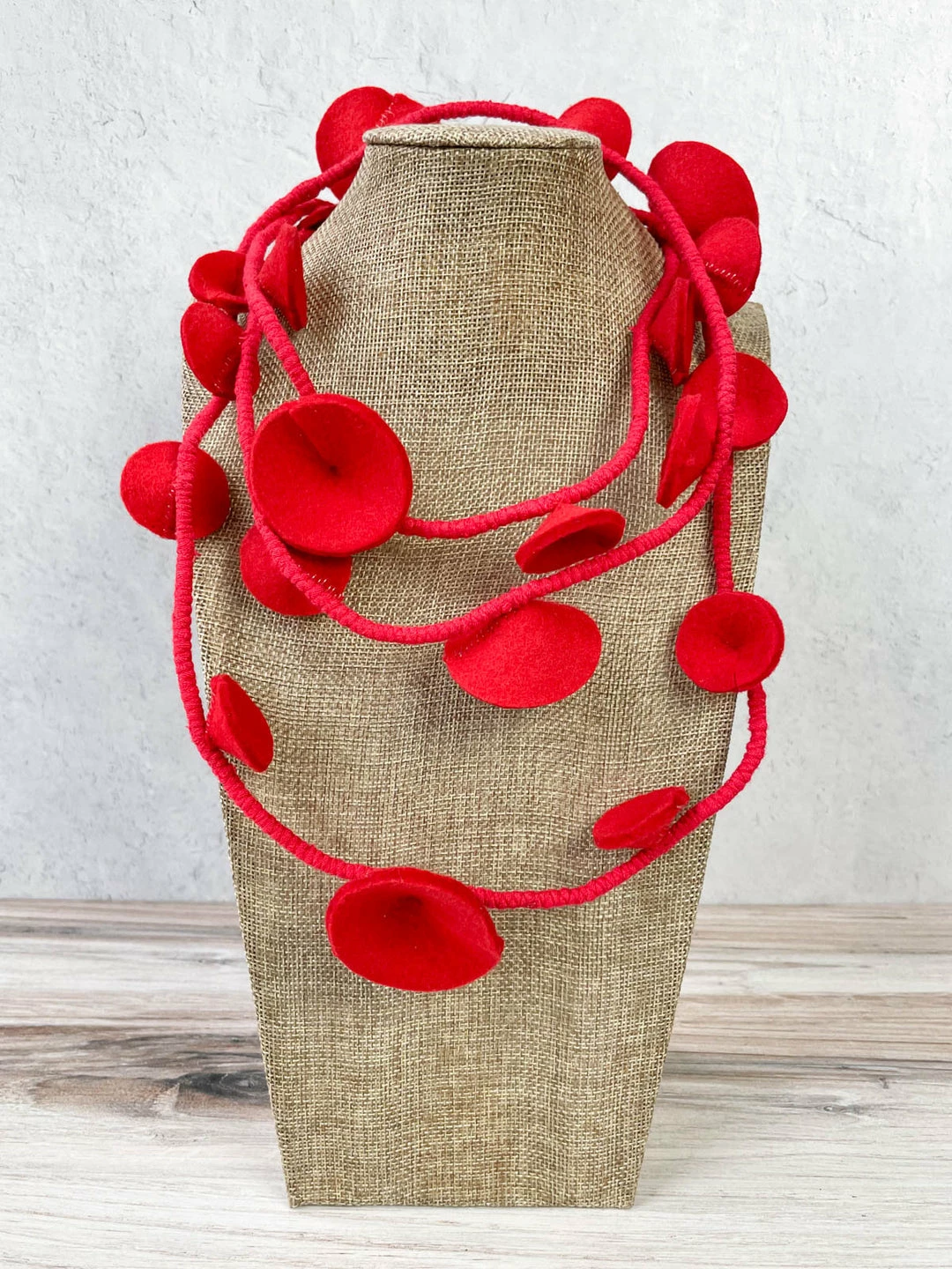 Beyond Threads’ Douli Necklace is a longer style that features various sized conical shapes dotted along wrapped fabric cord. A snap closure at back allows for this style to be doubled around the neck.