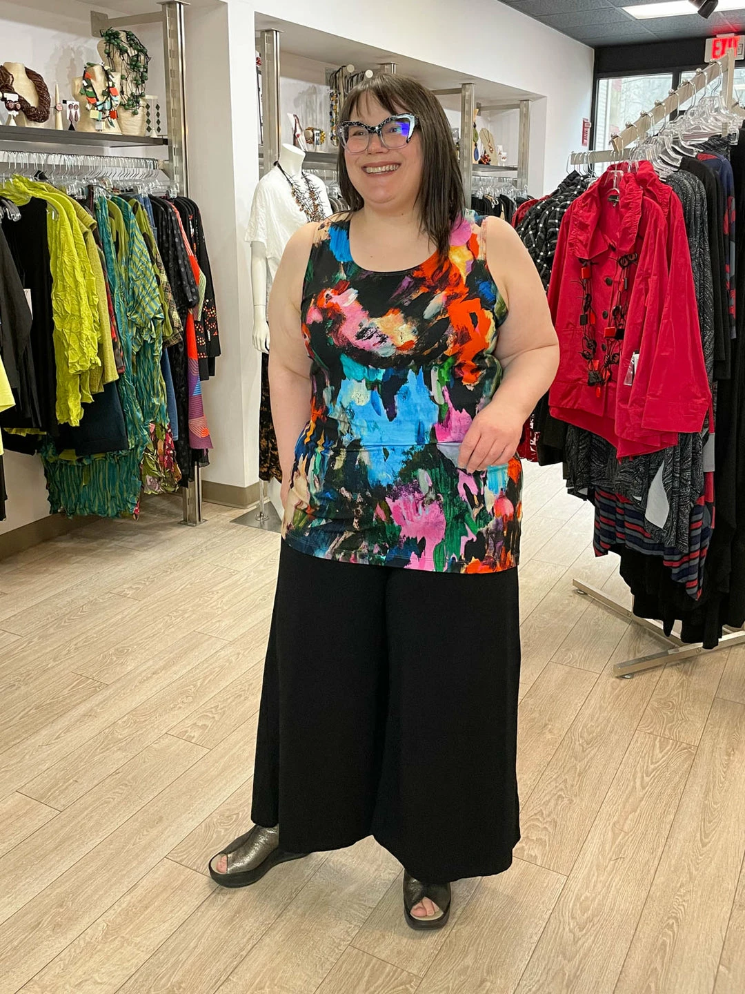 This slim fit tank is the perfect layering piece in a vibrant brush stroke print. With a scoop neckline, wide tank straps and a body skimming fit, it’s perfect to layer with cover ups, toppers and jackets without added bulk.