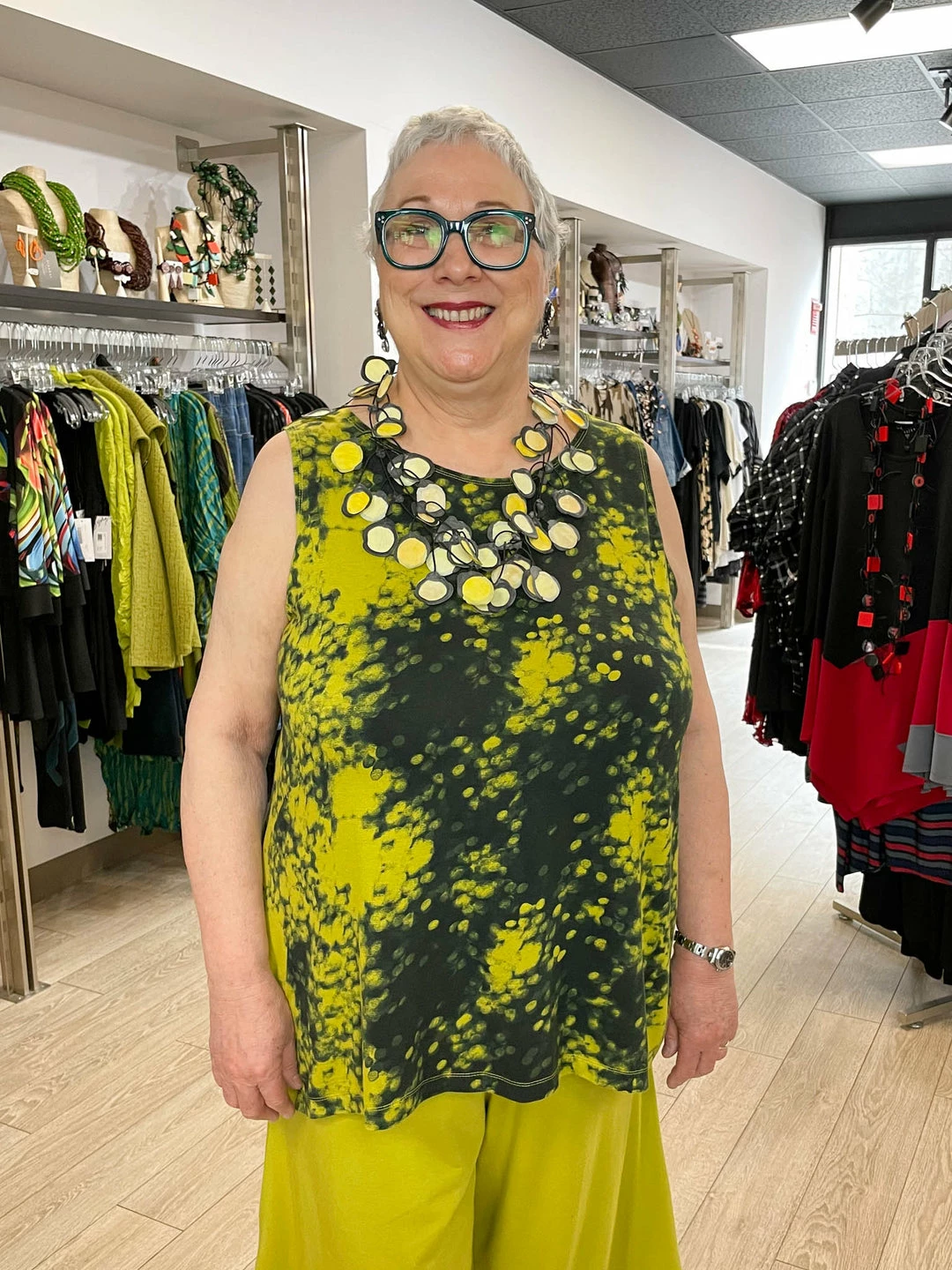 Karen (size 18 top, 14 bottom, 5’4″) wears size XL.