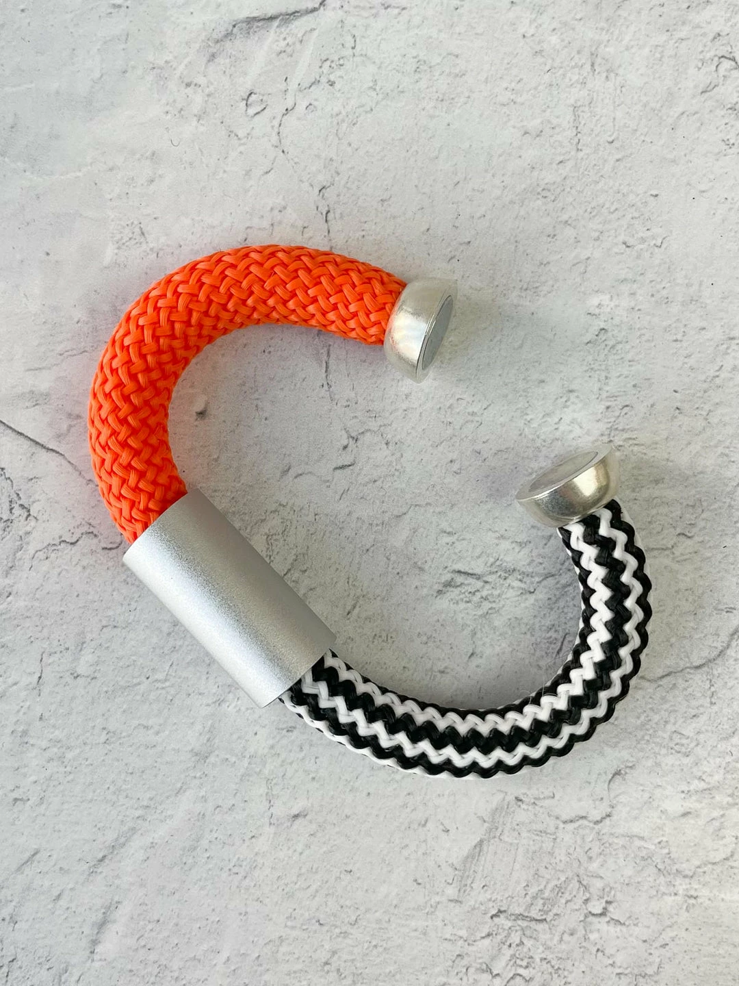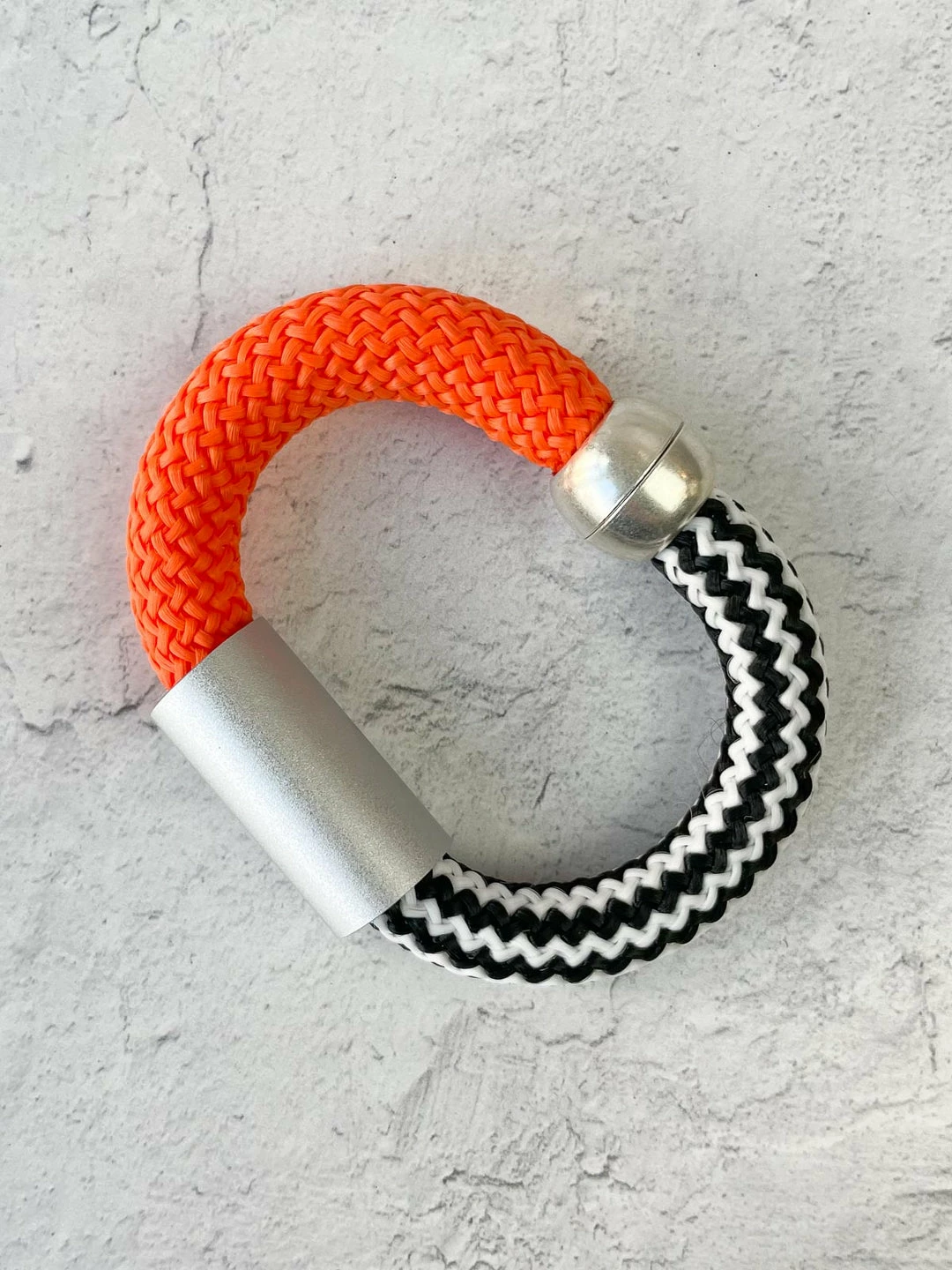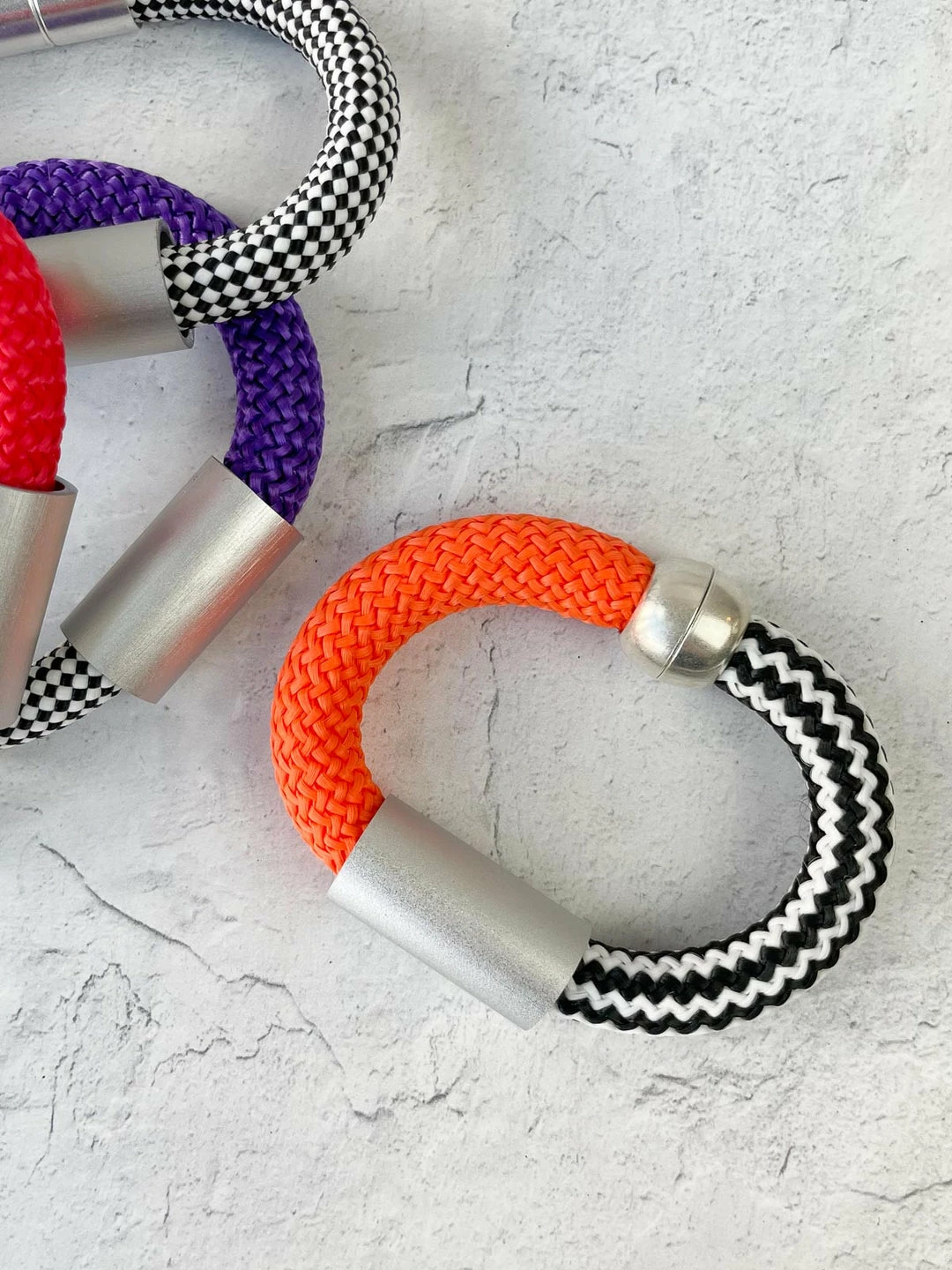 This stackable style features an aluminum tube centerpiece along a mix of solid and patterned woven cord. Magnet clasp at back for easy on and off.