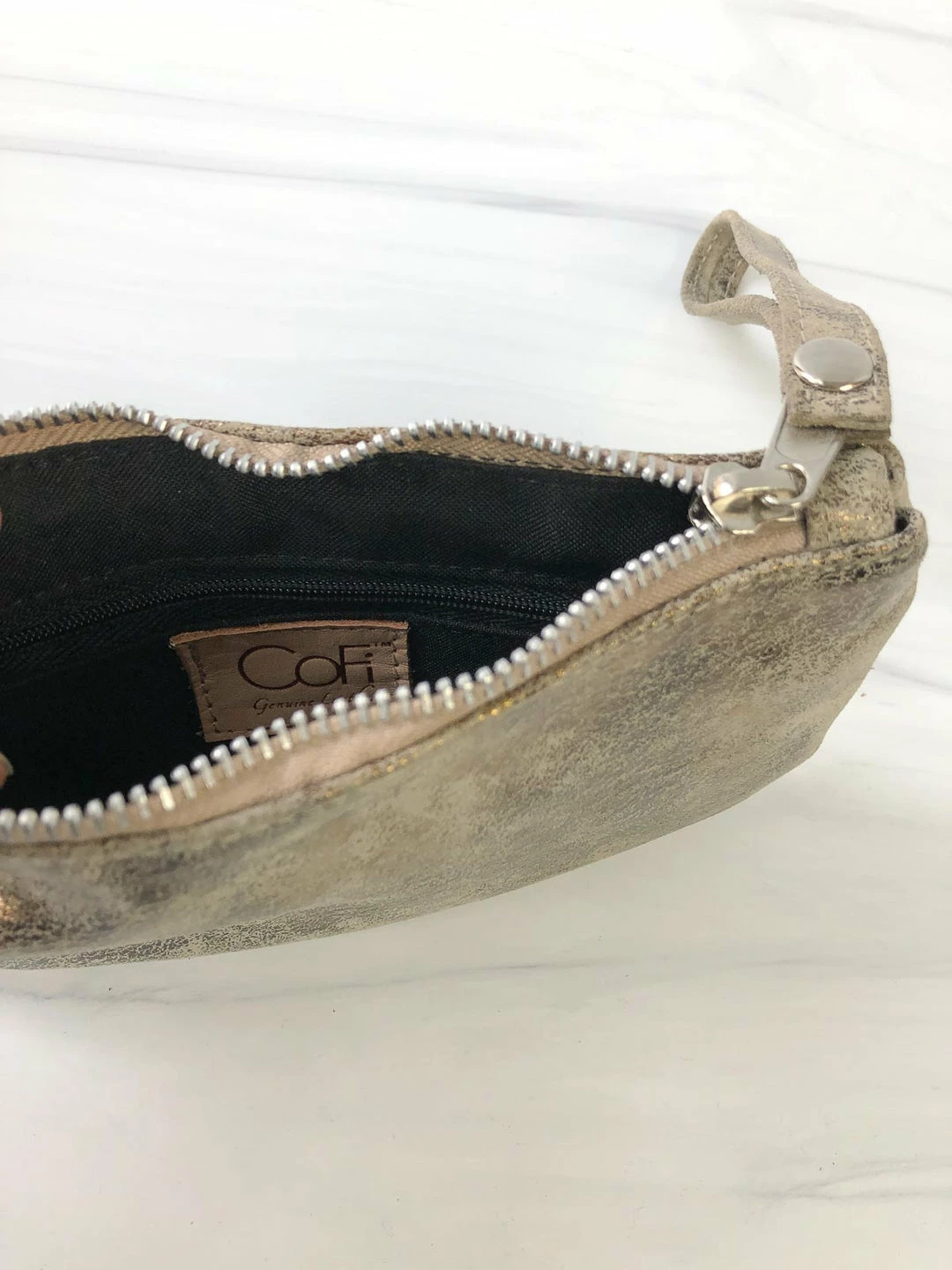 This small wristlet is the perfect size to carry your cellphone and a few essentials. Top zip closure has attached wristlet strap. Interior of black fabric with zipper pocket.