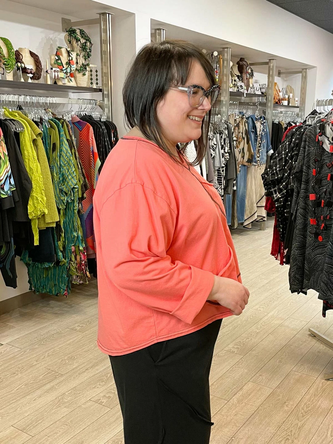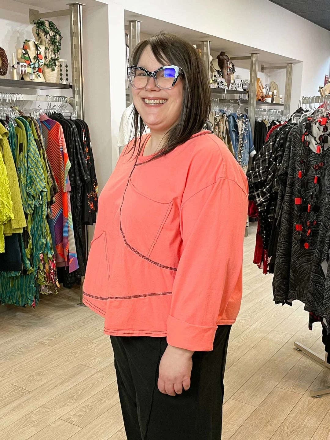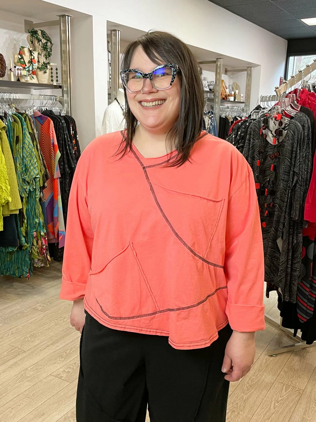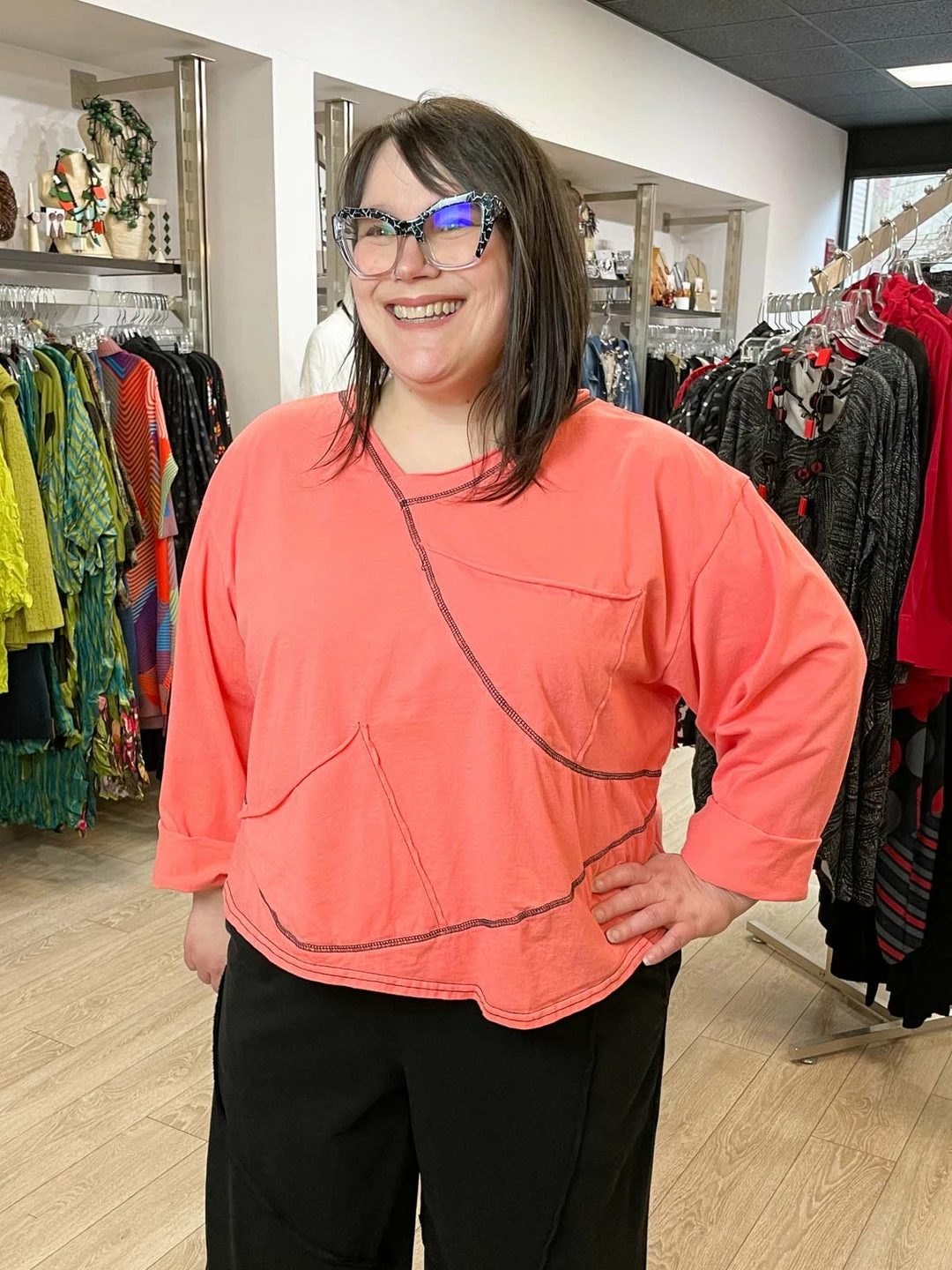The Wave Top from Cynthia Ashby is a casual yet artsy style in a cotton jersey knit. It has an oversized boxy body with seam and pocket details at front. The offset v neckline, long dropped sleeves and wavy uneven hemline complete the details. Raw edges accent the style throughout, along with overstitch detailing.Â