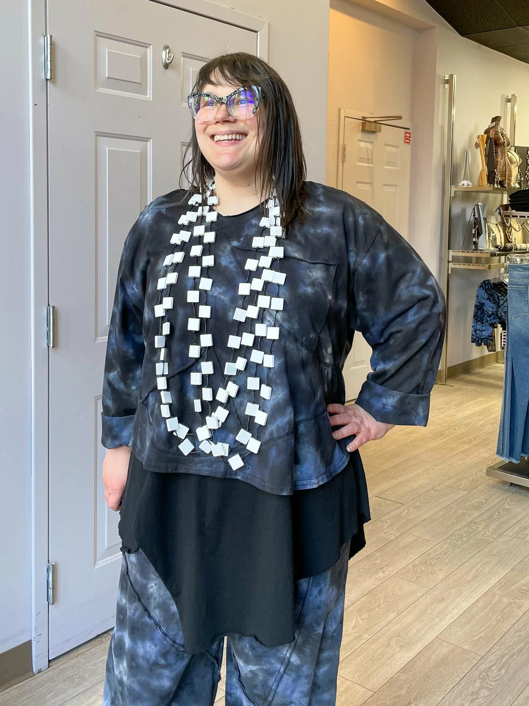 The Wave Top from Cynthia Ashby is a casual yet artsy style in a cotton jersey knit. With all-over Storm hand-dye in black, greys and blues, it has an oversized boxy body with seam and pocket details at front. The offset v neckline, long dropped sleeves and wavy uneven hemline complete the details. Raw edges accent the style throughout, along with overstitch detailing.Â