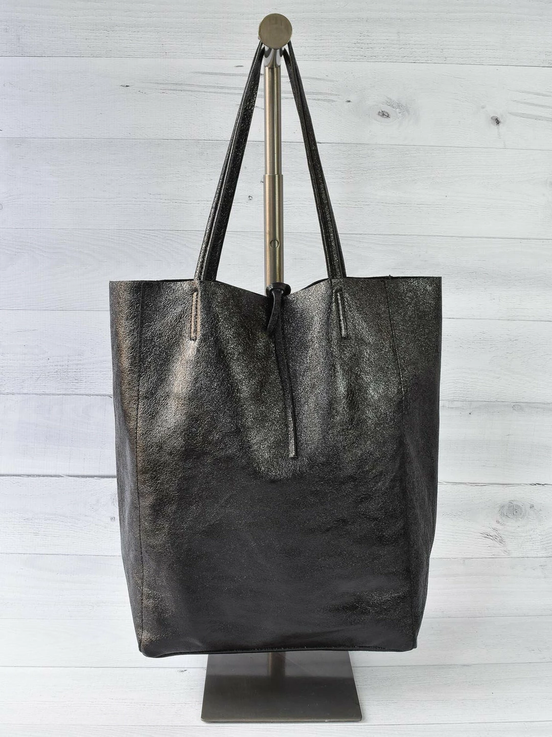 This classic tote has a two handled body with tie closure at top. Bottom gusset has fold over flap at interior to keep from sagging. Unlined with one 7″ square zipper pocket inside.