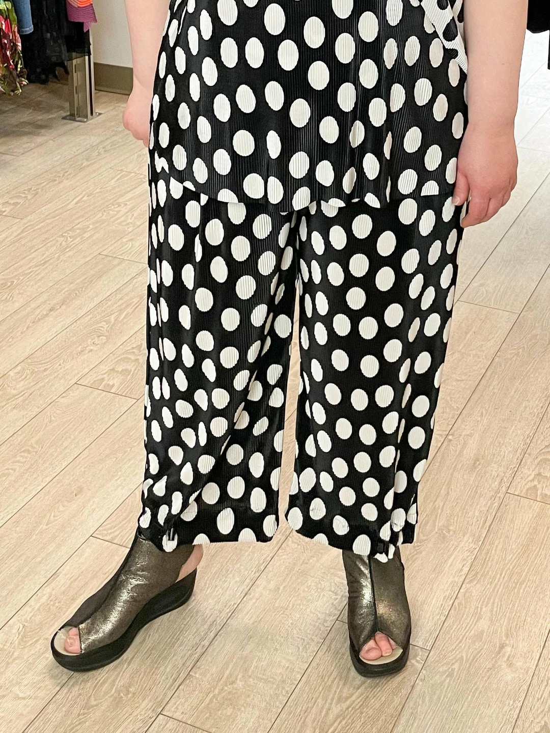 Kozan’s Andi Pant is a straight leg cropped style with cinch drawstring detail at hemline. Pull on waistband has a pleat front, elastic at back and side seam pockets. The Pepper fabric is a satin finish pleated knit in black and cream dots.