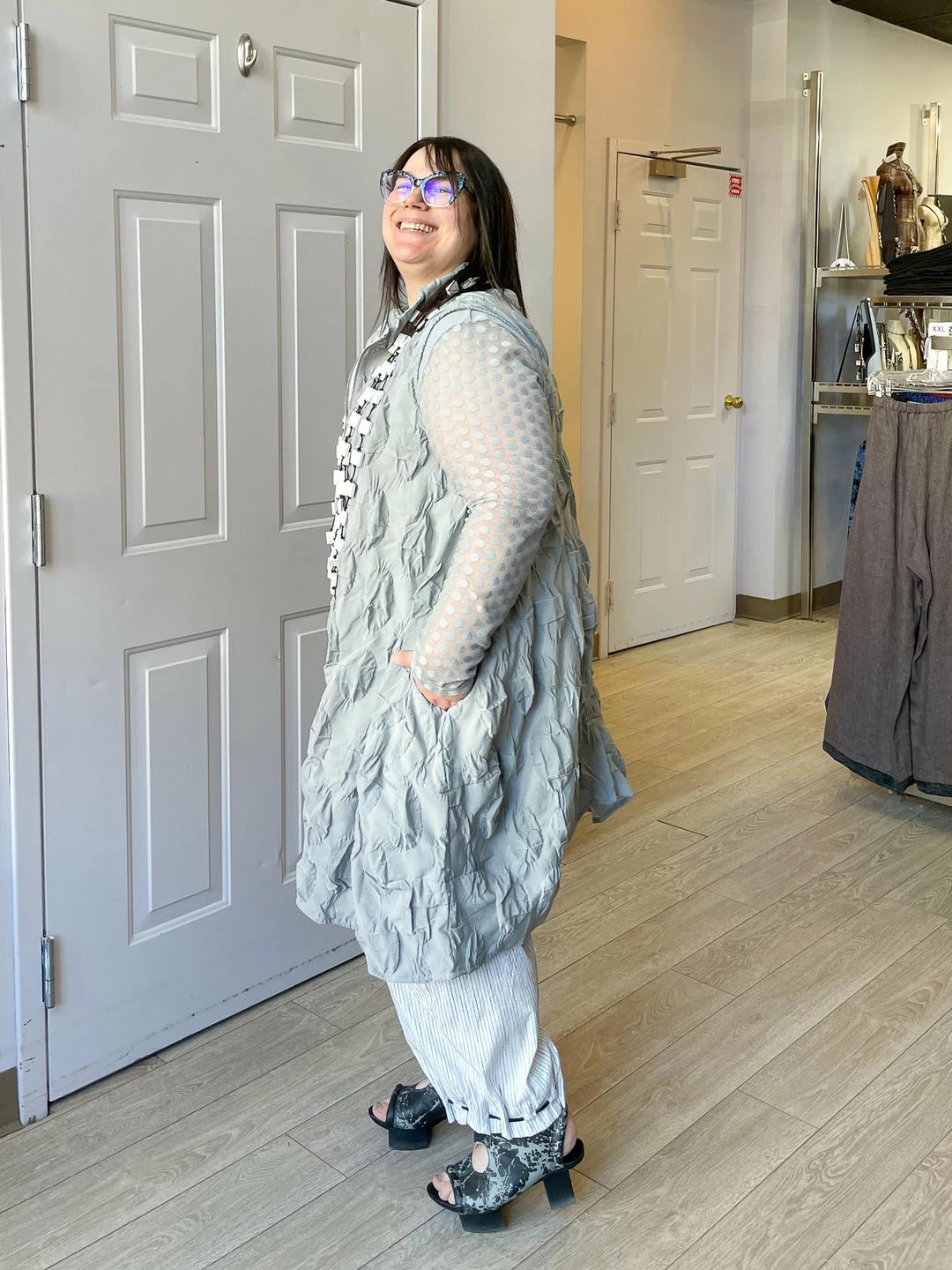 Andrea (size 14/16, 5’3″) wears size XL in photos shown with Andi Pant. Andrea also wears size L in photos shown with Chalet basics.