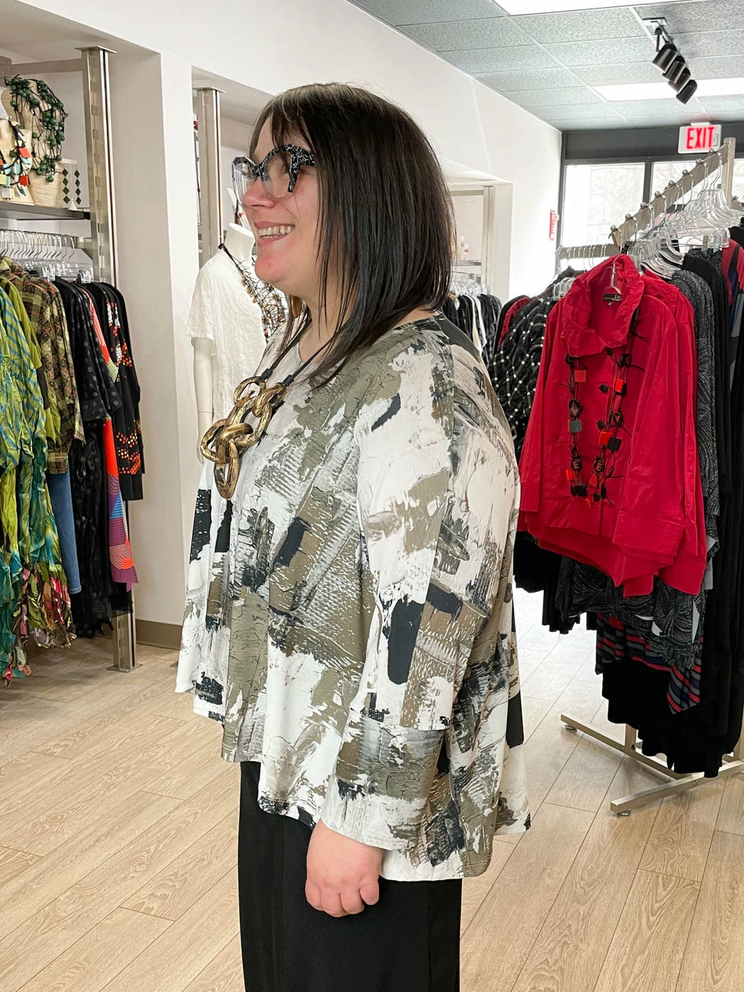 Andrea (size 14/16, 5’3″) wears size XL.