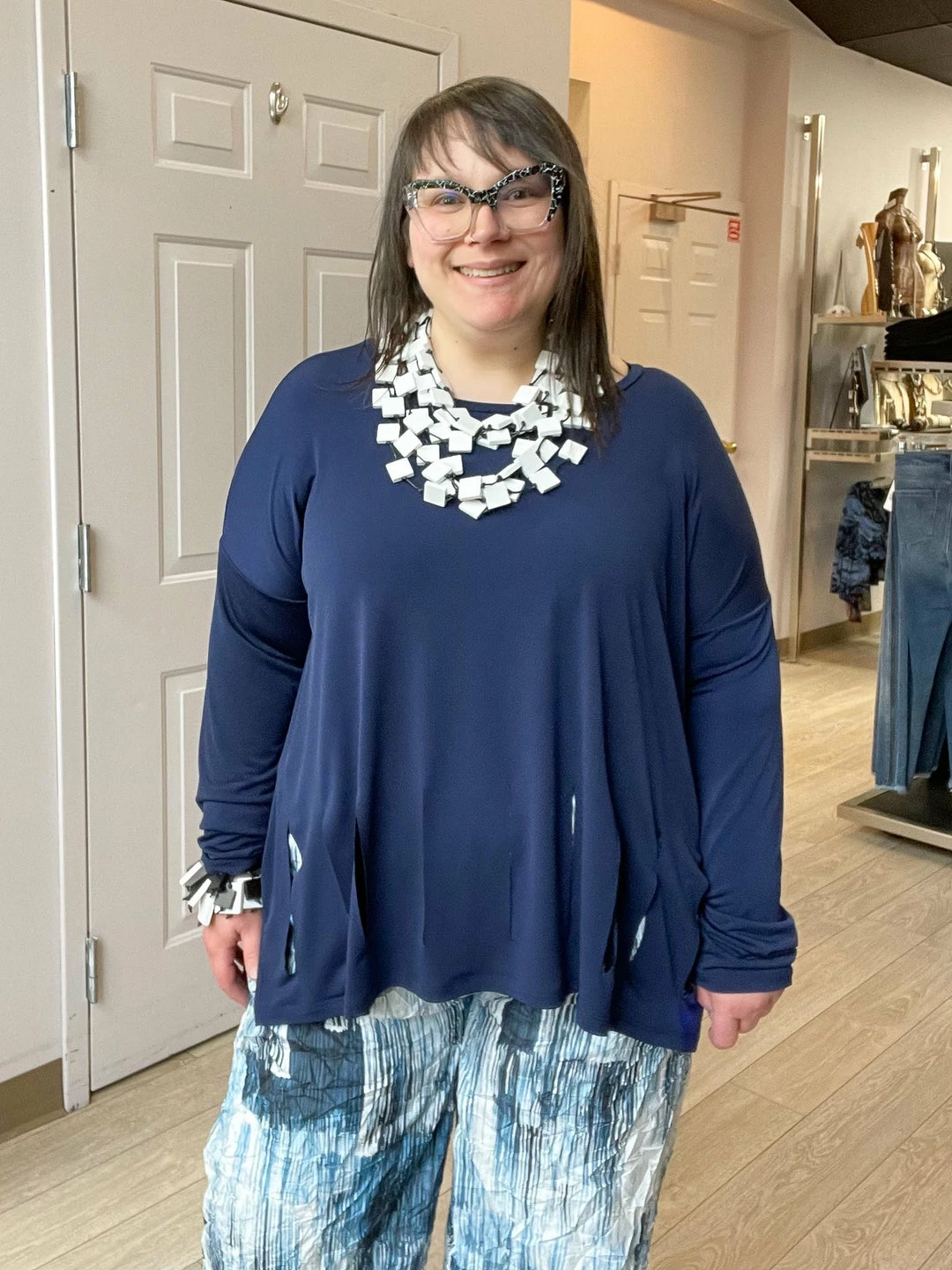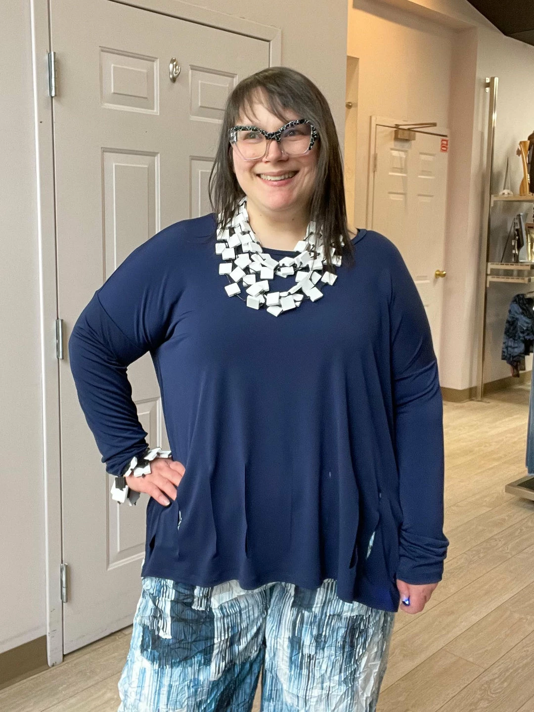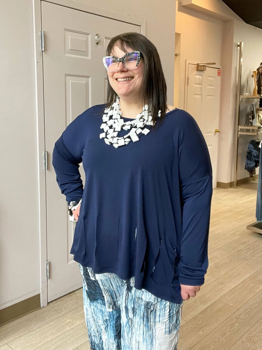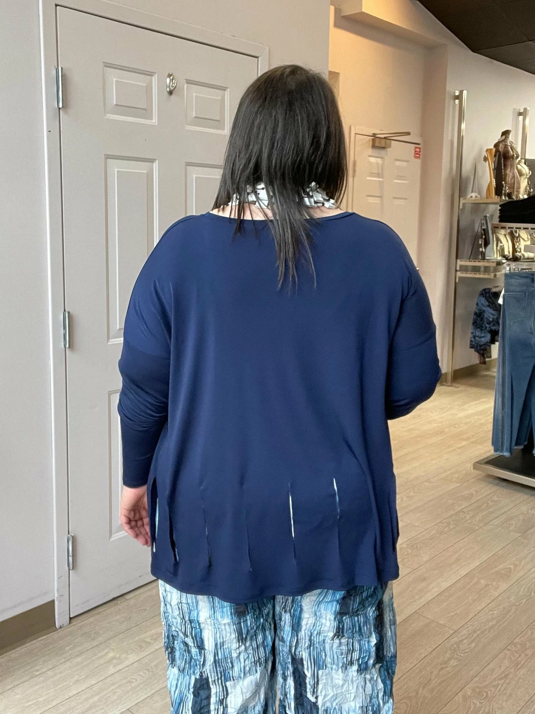 From Kozan’s unique Cut-Out Vogue collection, the Delano Top has a boxy body with vertical cut detail at bottom. A round neckline, side vents and long dropped sleeves finish off the look.