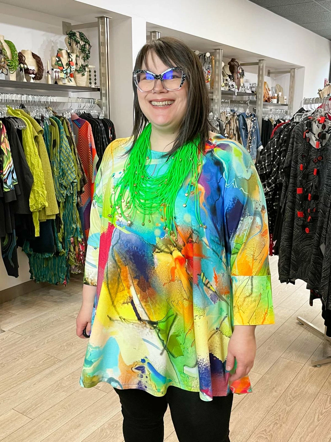 Inspired by one of Kozan’s signature silhouettes – Danika – this longer length style has a swingy oversized body with curved hemline. A round neckline and dolman style cinched three quarter sleeves finish off the look. The Sorbet print is a painterly mix of multi colors.