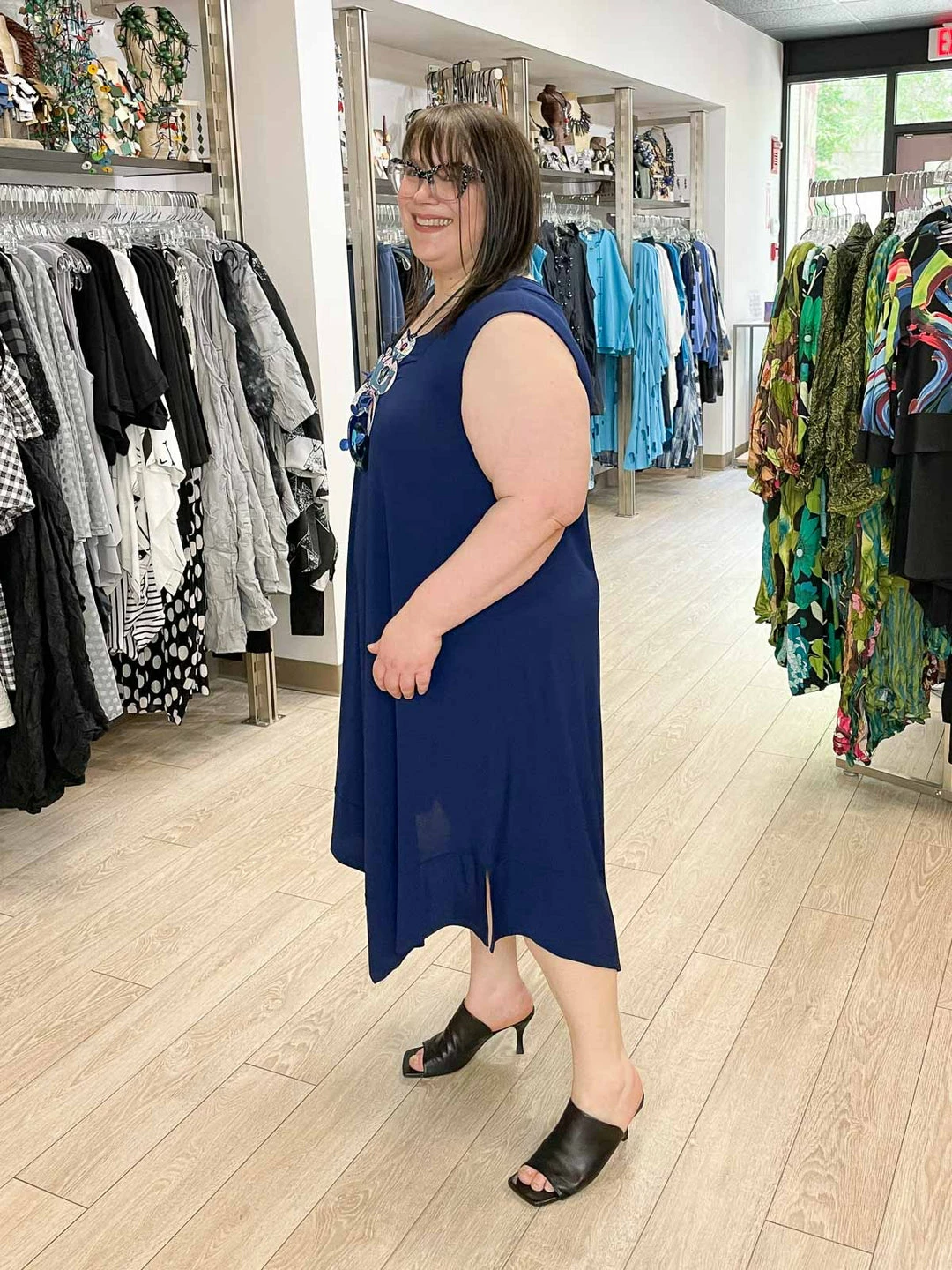 Andrea (size 14/16, 5’3″ ) models size XL, but can also wear size L.