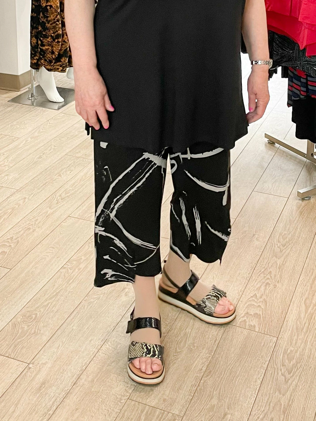 The Jemma Pant is a cropped style with angled hemline and dart detail. It’s pull-on waist features a flat front with elastic at back and side seam pockets. Kozan’s Strike fabric is a stretch knit with taupe brushstroke print.