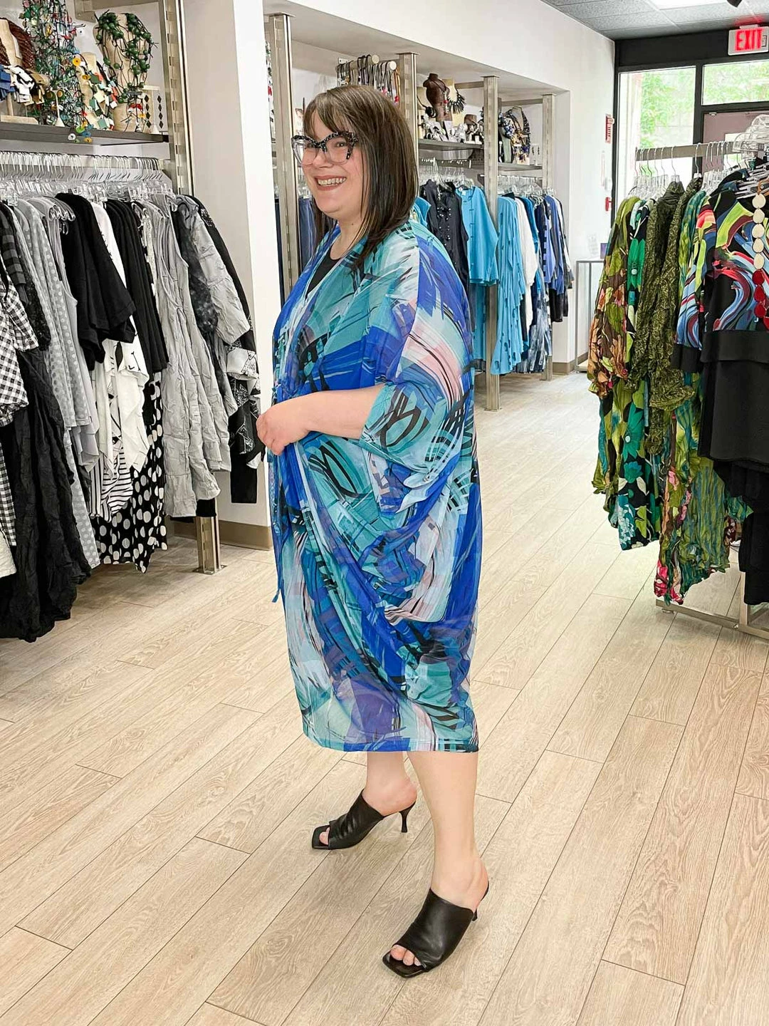 This chic topper has an oversized body that tapers to hemline, with a cinch drawstring at center. A v-neckline and short sleeve armholes complete the style. In sheer printed mesh, this topper can pair over your basics easily.