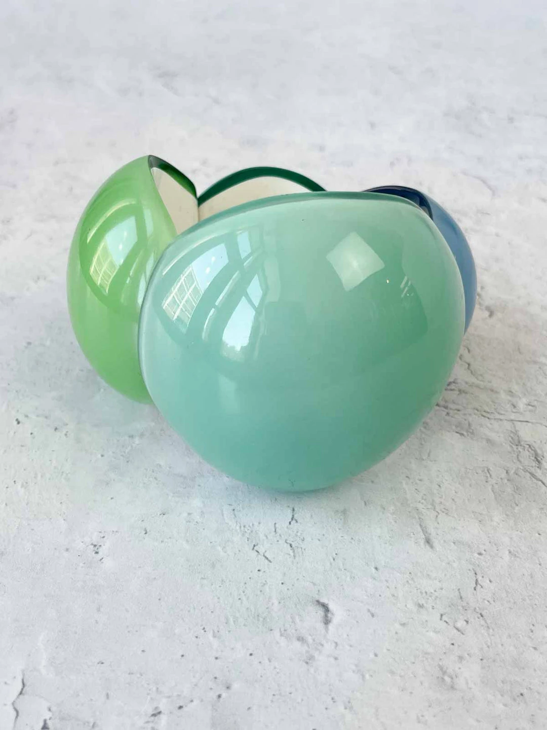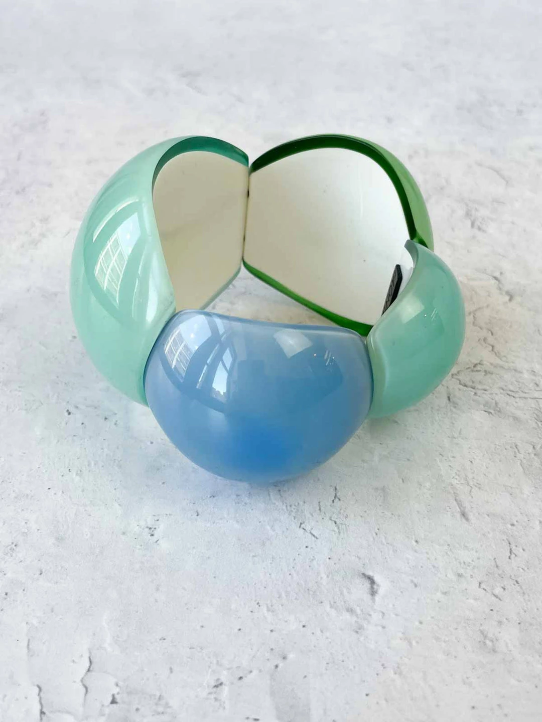 This statement cuff bracelet features four large domed bubble shapes in soft aqua and pale blue high shine acrylic. On stretch cord, this cuff slips over the wrist and has a bold three-dimensional effect.
