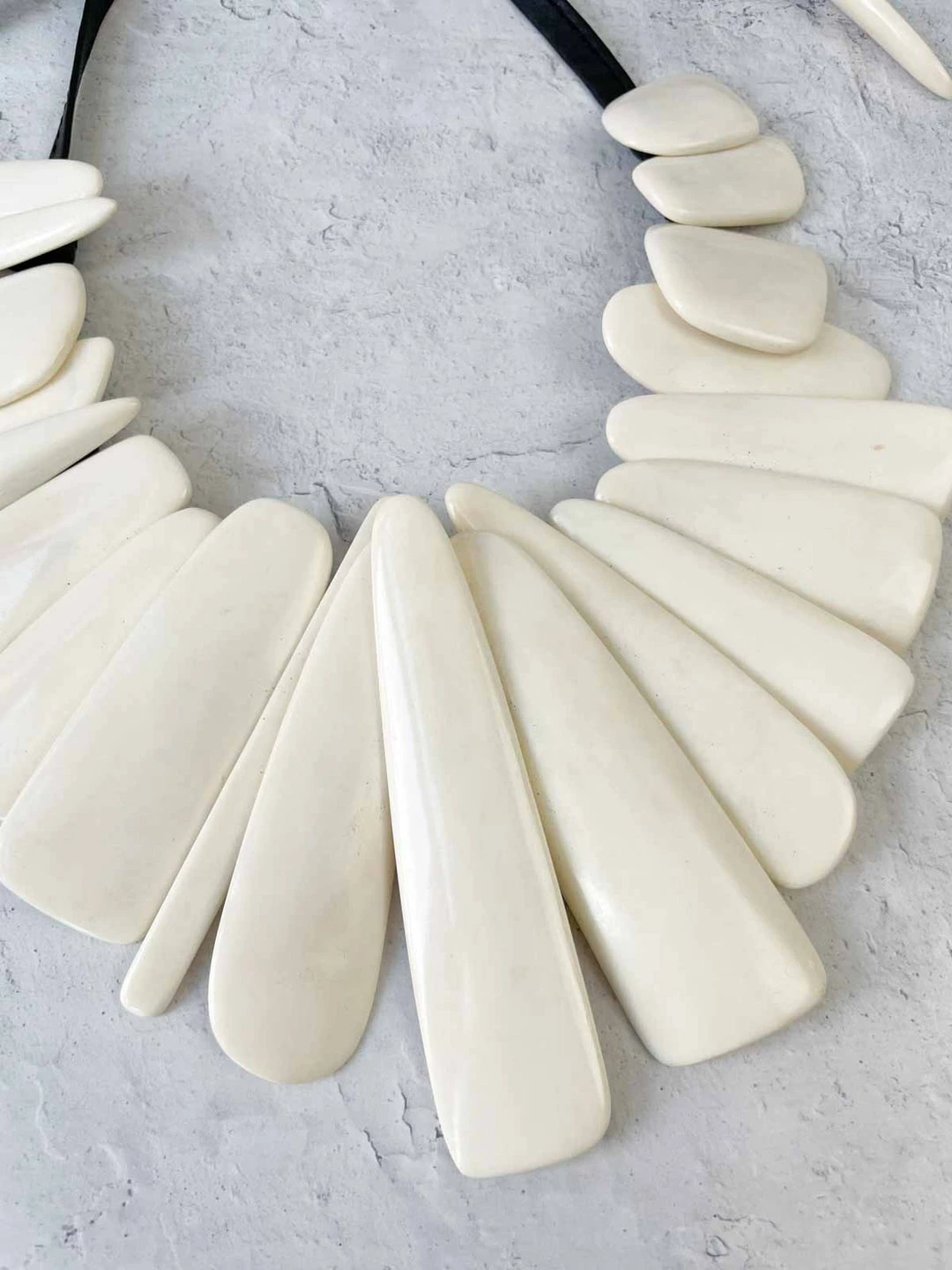 This large statement necklace features a bib of polished natural bone on leather cord. The organicly shaped piece are larger at center (with a 5″ drop) and taper to the ends. The leather tie back is finished with matching bone tips.