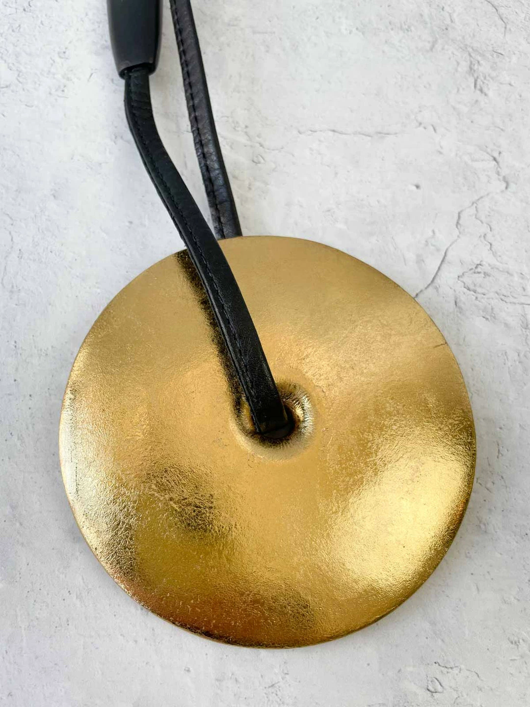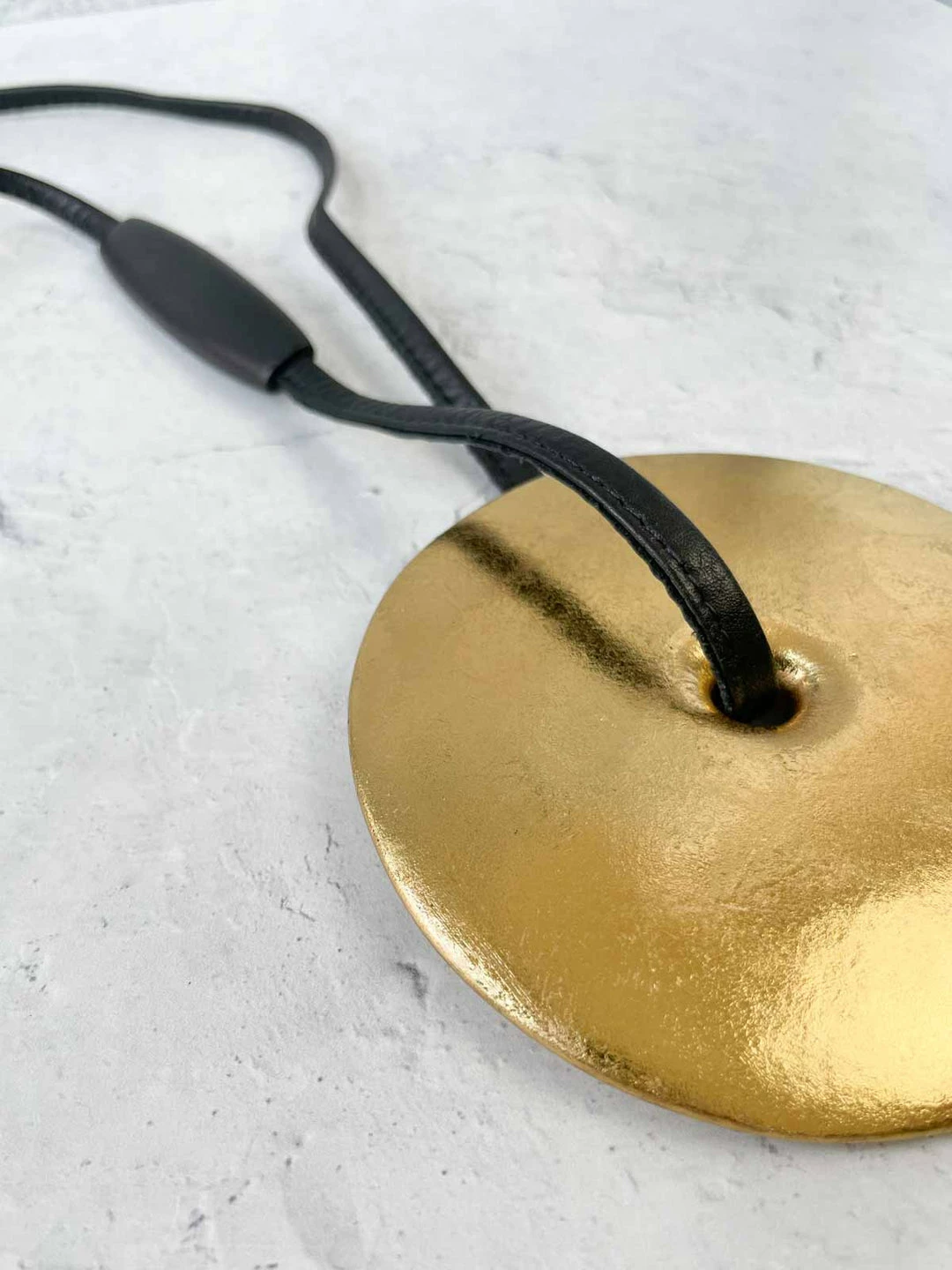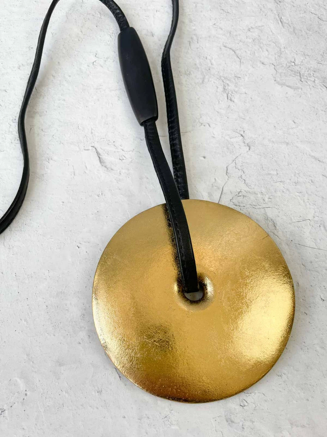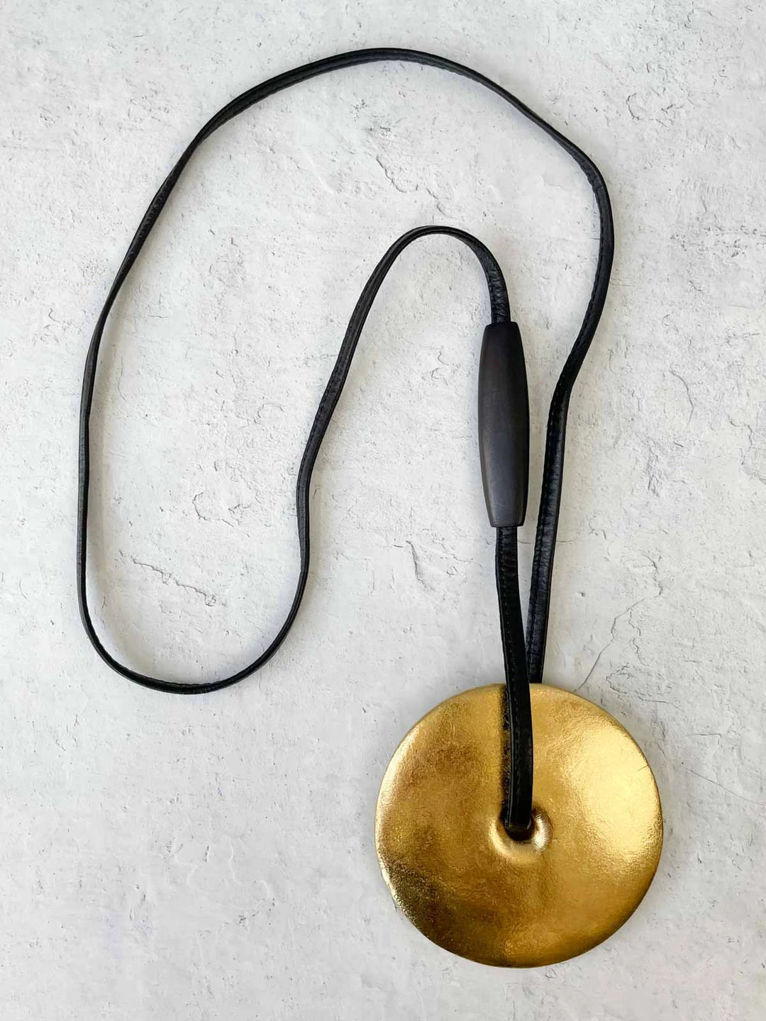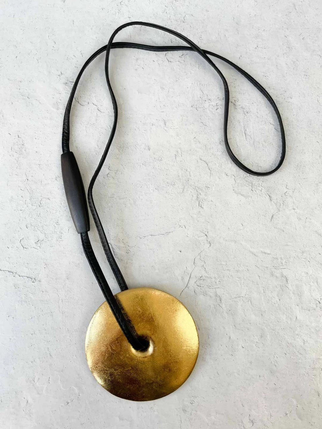 This long necklace style features a gold foilded circular pendant on leather cord, with a wood accent bar.