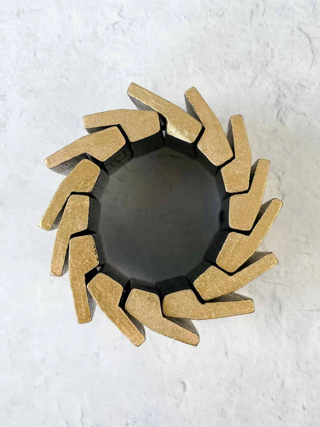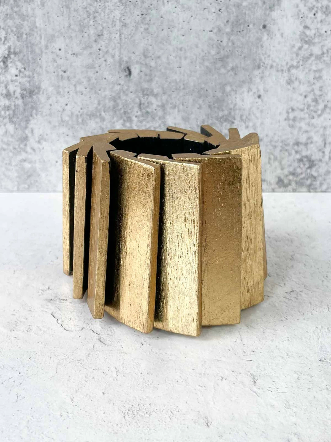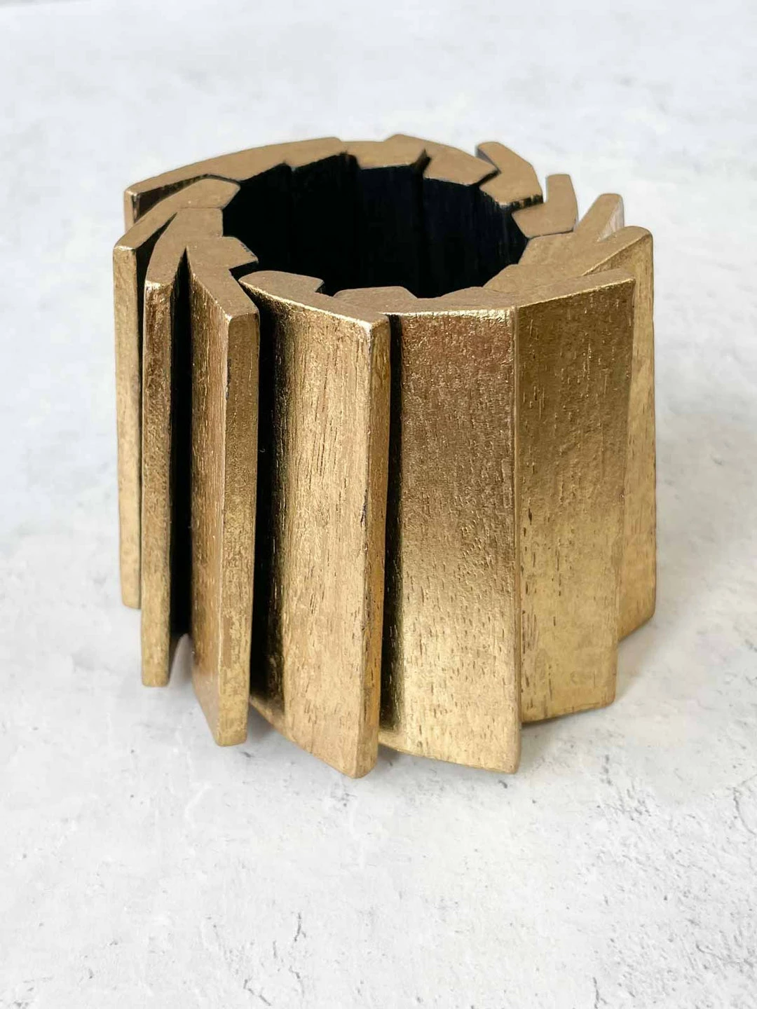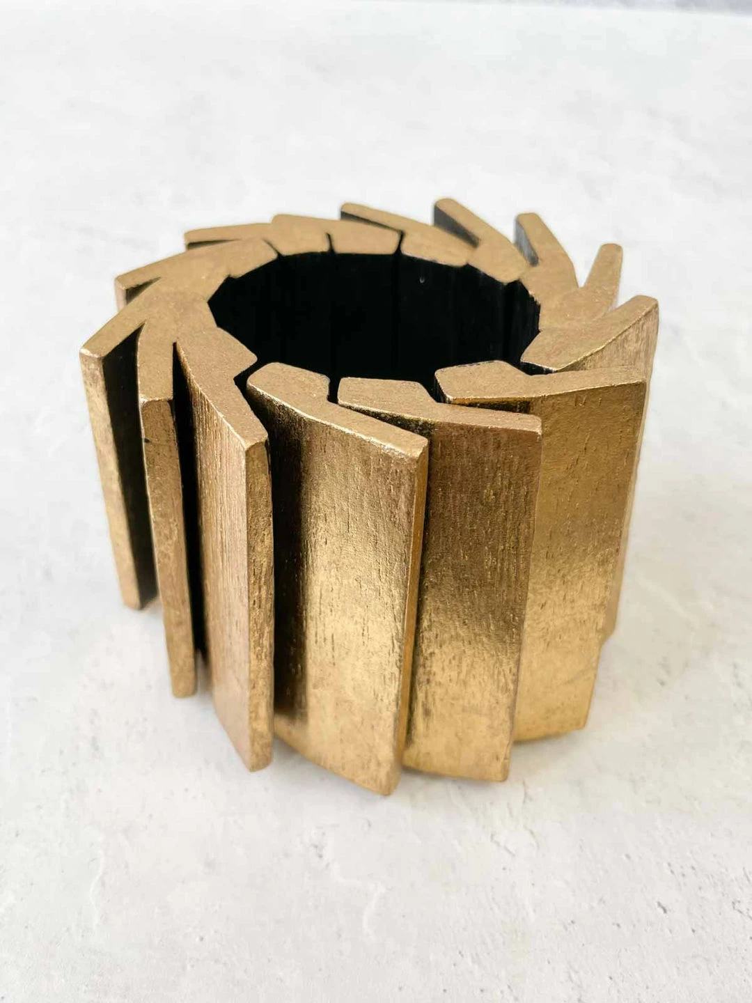 This statement cuff features an interlocking design in gold foiled acacia wood. It’s slightly tapered to fit the wrist and has stretch elastic making it easy to get on and off.