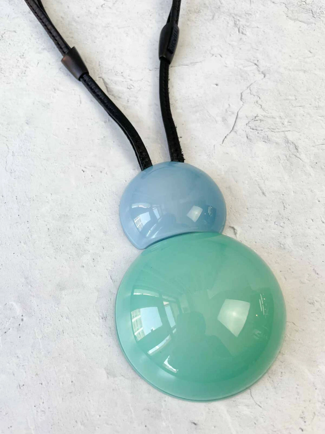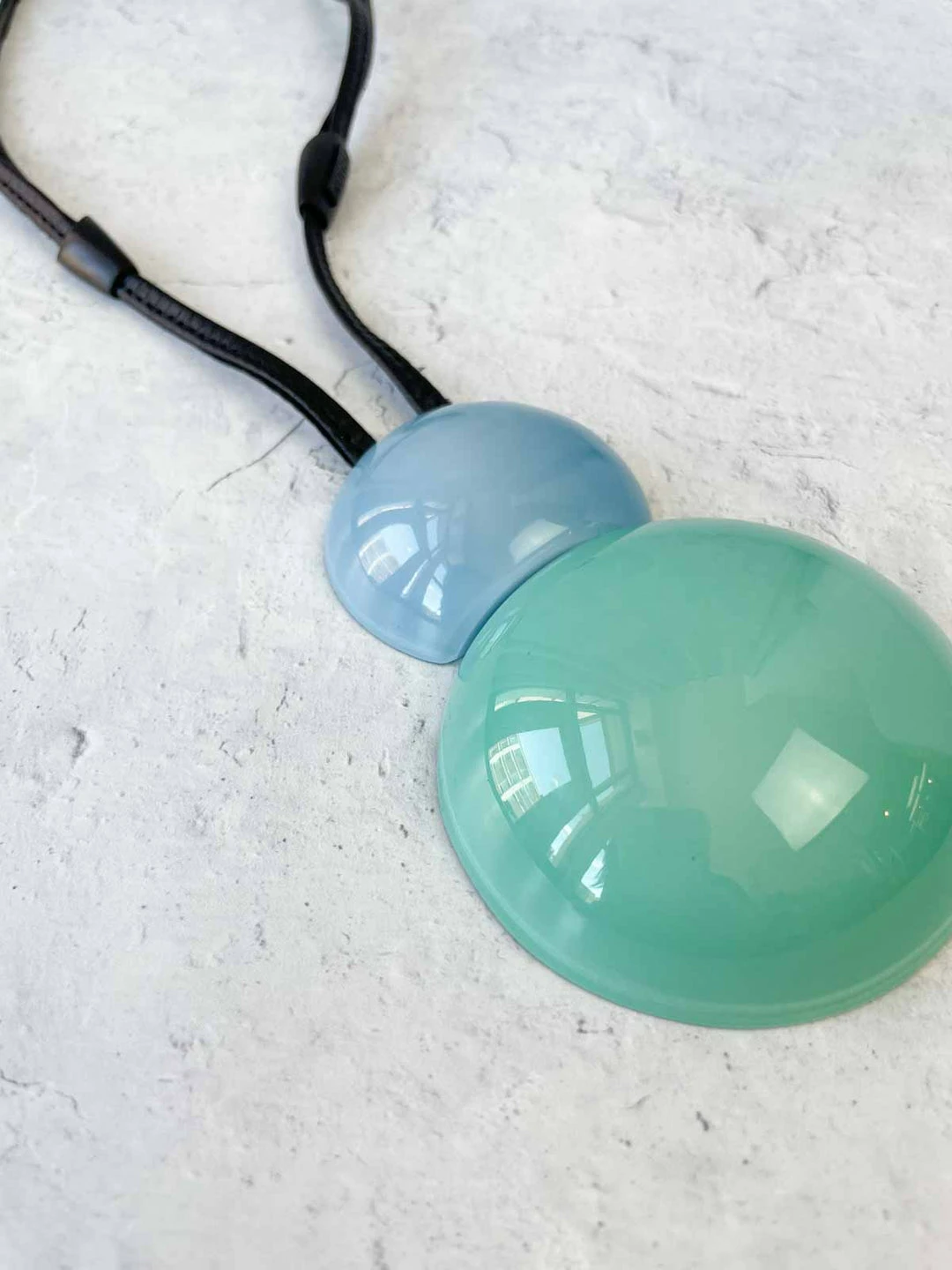 This classic pendant has a modern feel, with two large dome bubble shapes in soft aqua and pale blue high shine acrylic. Leather cord adjusts, so you can wear at whatever length you please.
