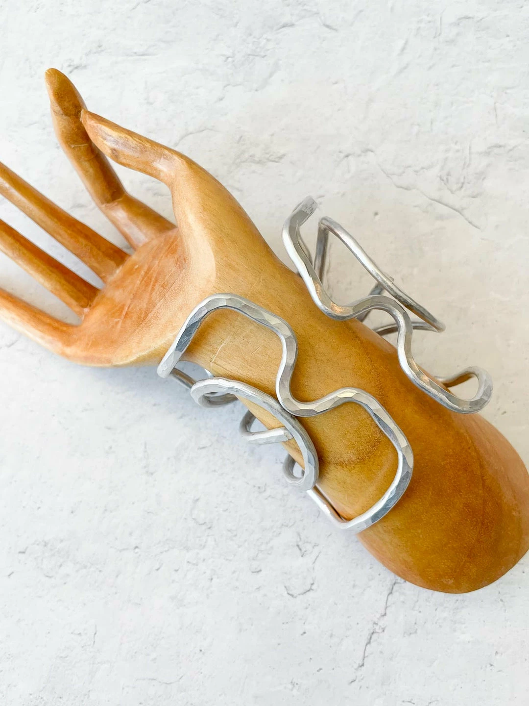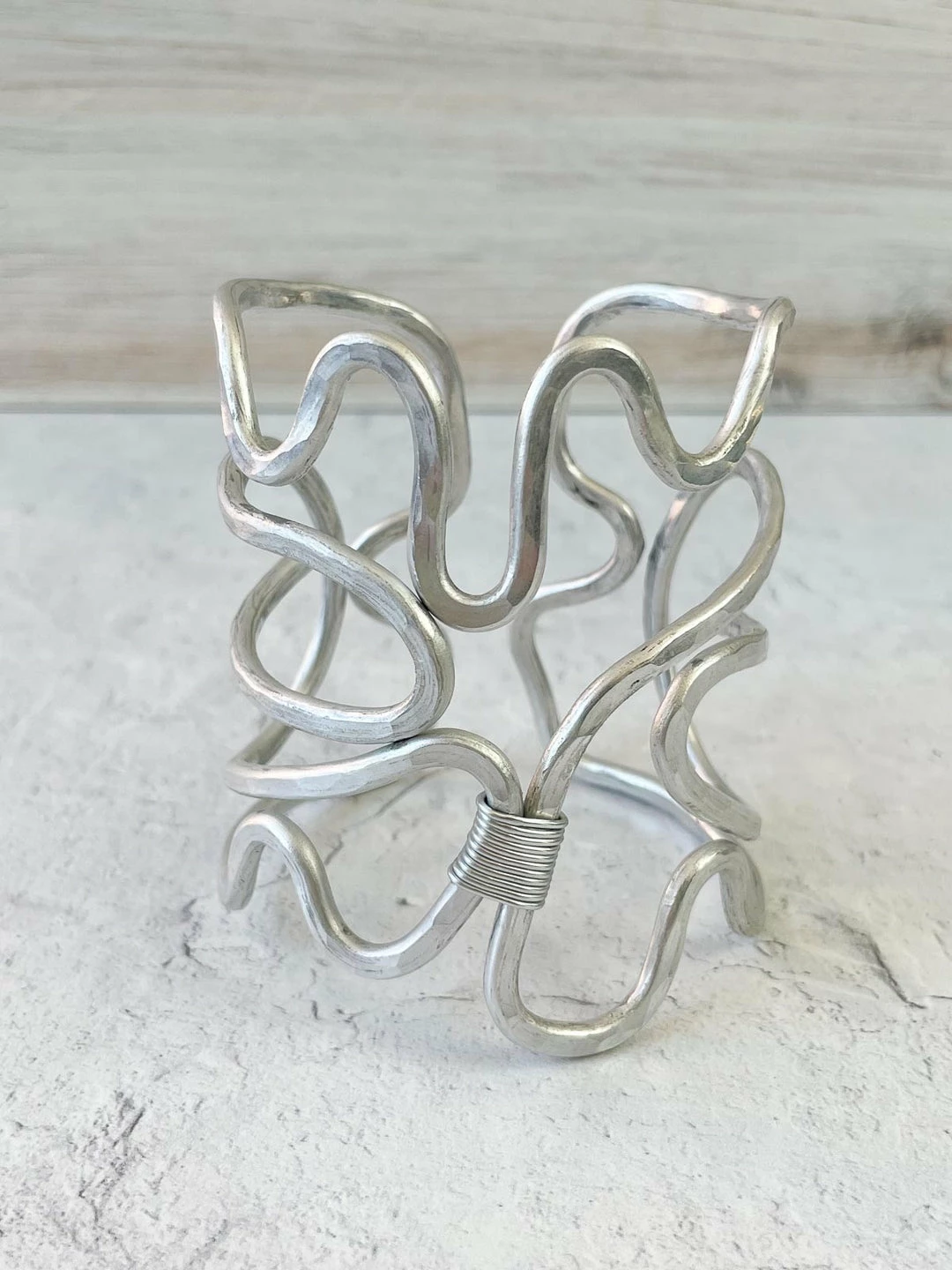 The Amaze statement cuff bracelet from OC is an extra wide design with open design hammered wire. This bold style has an opening at one side for easy on and off.