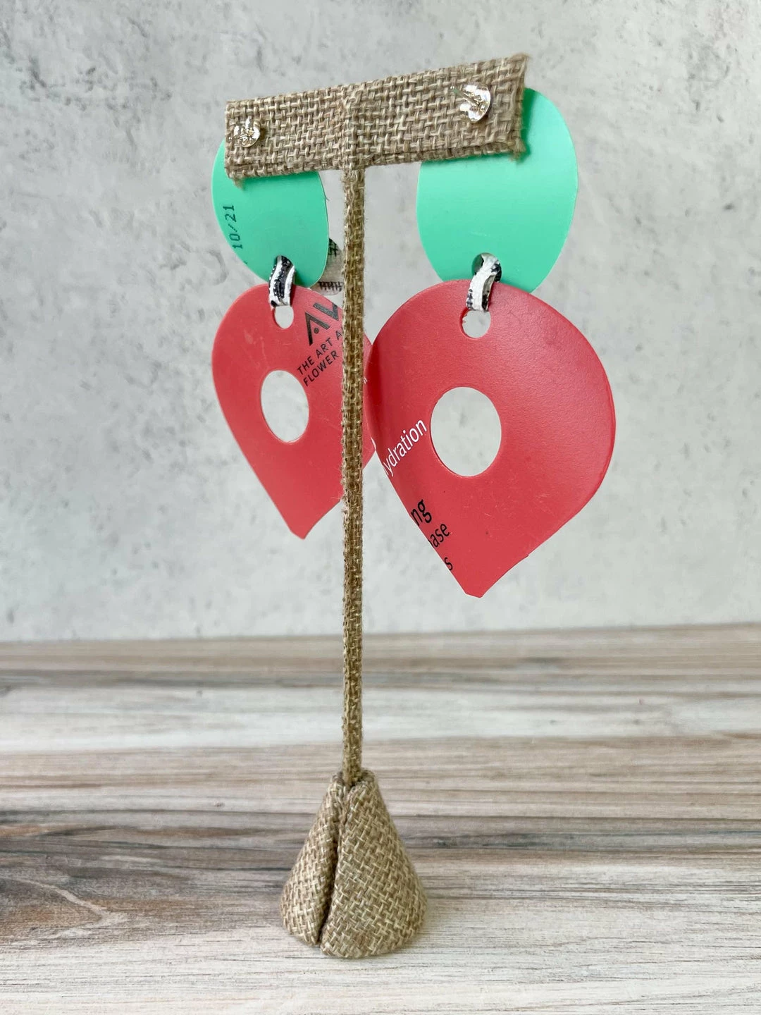 Artist Criselda Lopez creates unique wearable art using a range of upcycled materials. These large teardrop shaped drop earrings feature die cut plastic from recycled bottles, along with textured printed paper on petite silver posts.