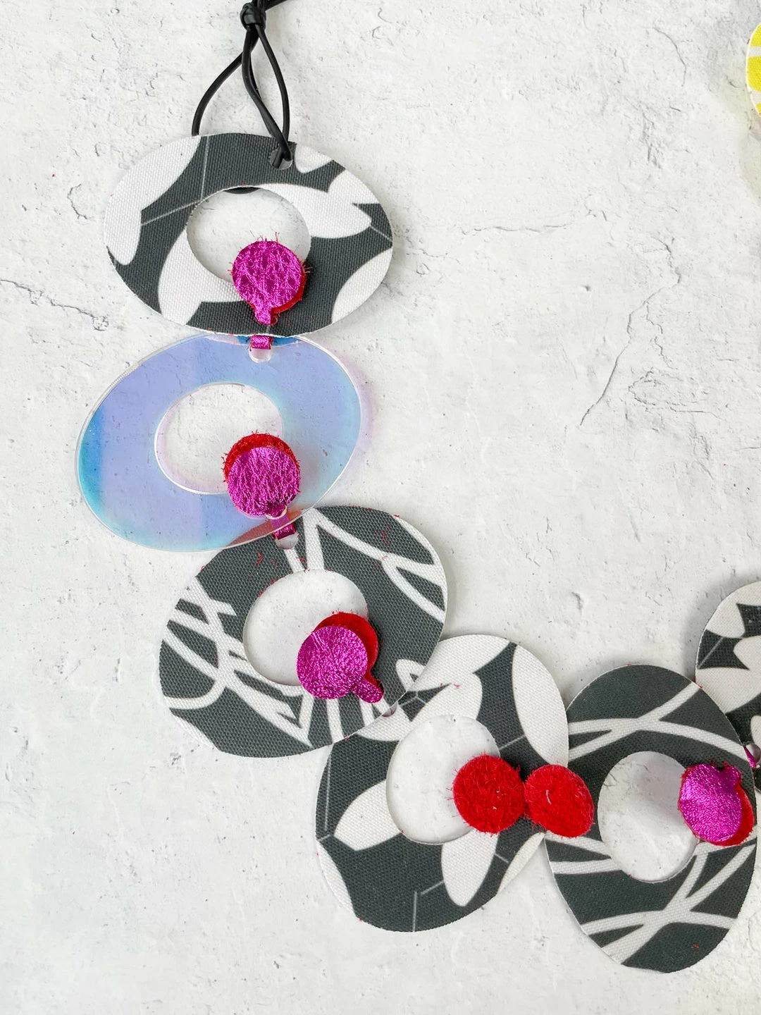 Artist Criselda Lopez creates unique wearable art using a range of upcycled materials. This long necklace features open cut-out die cut ovals and rounds in acrylic and textured fabric sheeting, all linked together with coordinating fabric or leather, hanging on knotted rubber cord.