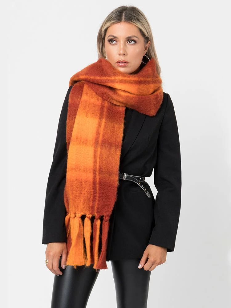 This on-trend blanket scarf has a felted look, in an oversized check plaid pattern of orange and red. Large rectangular shape with tied tassel ends.