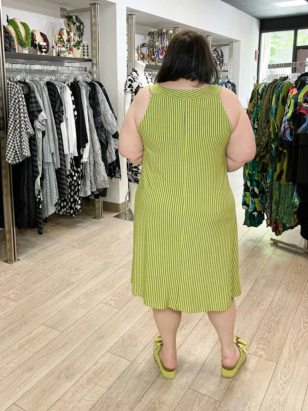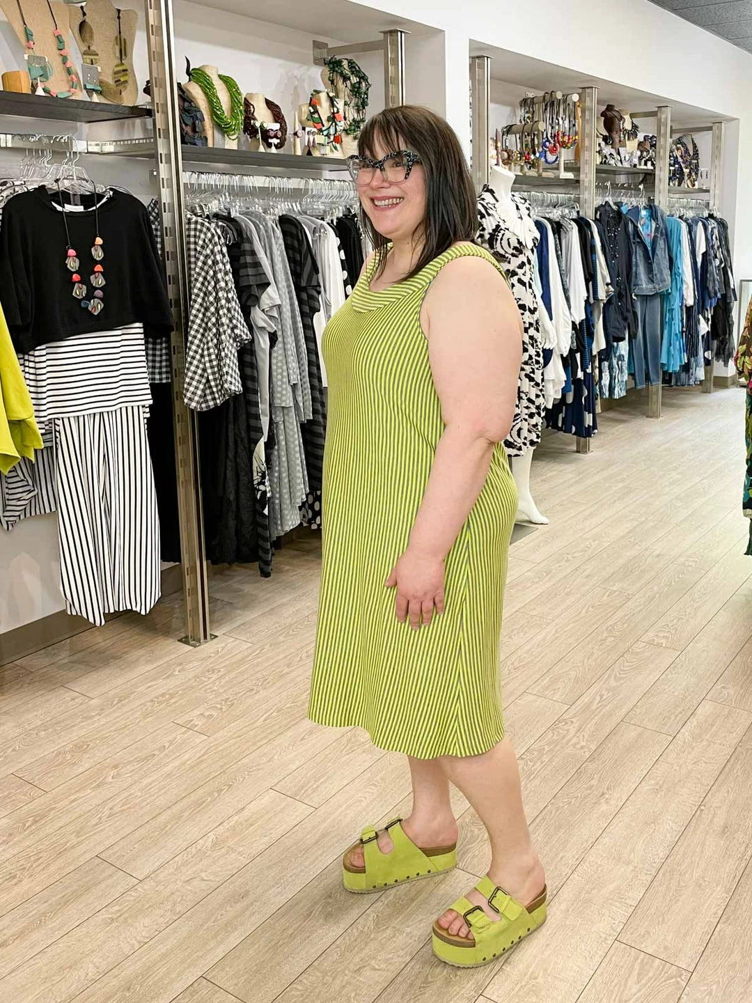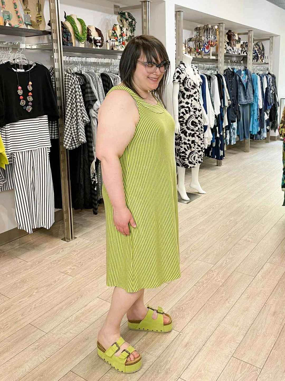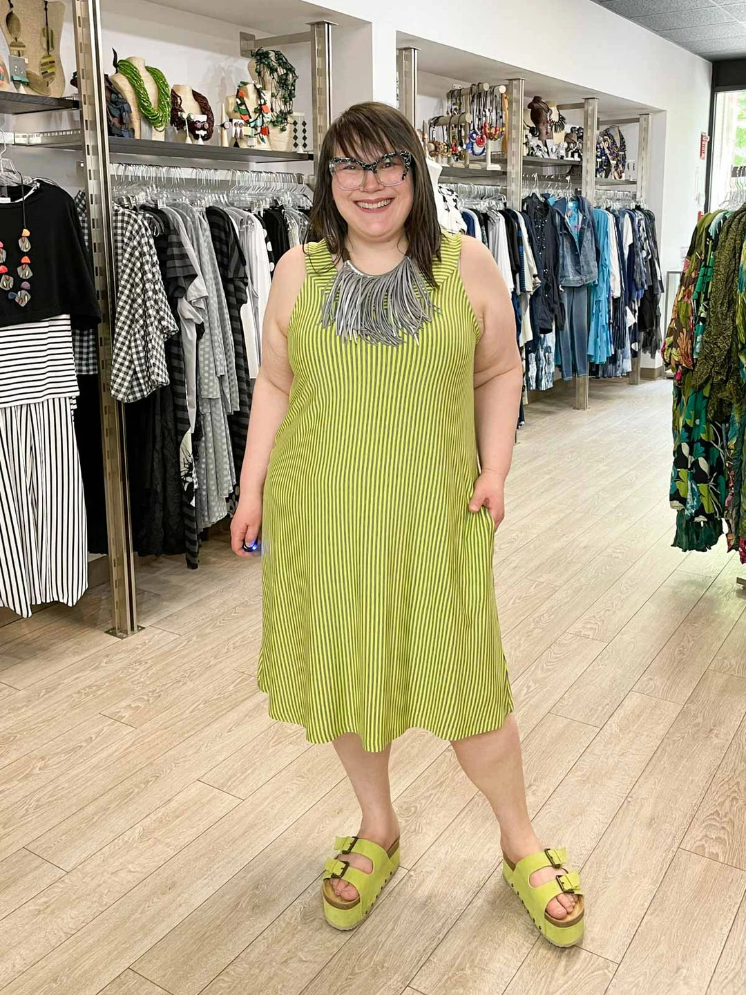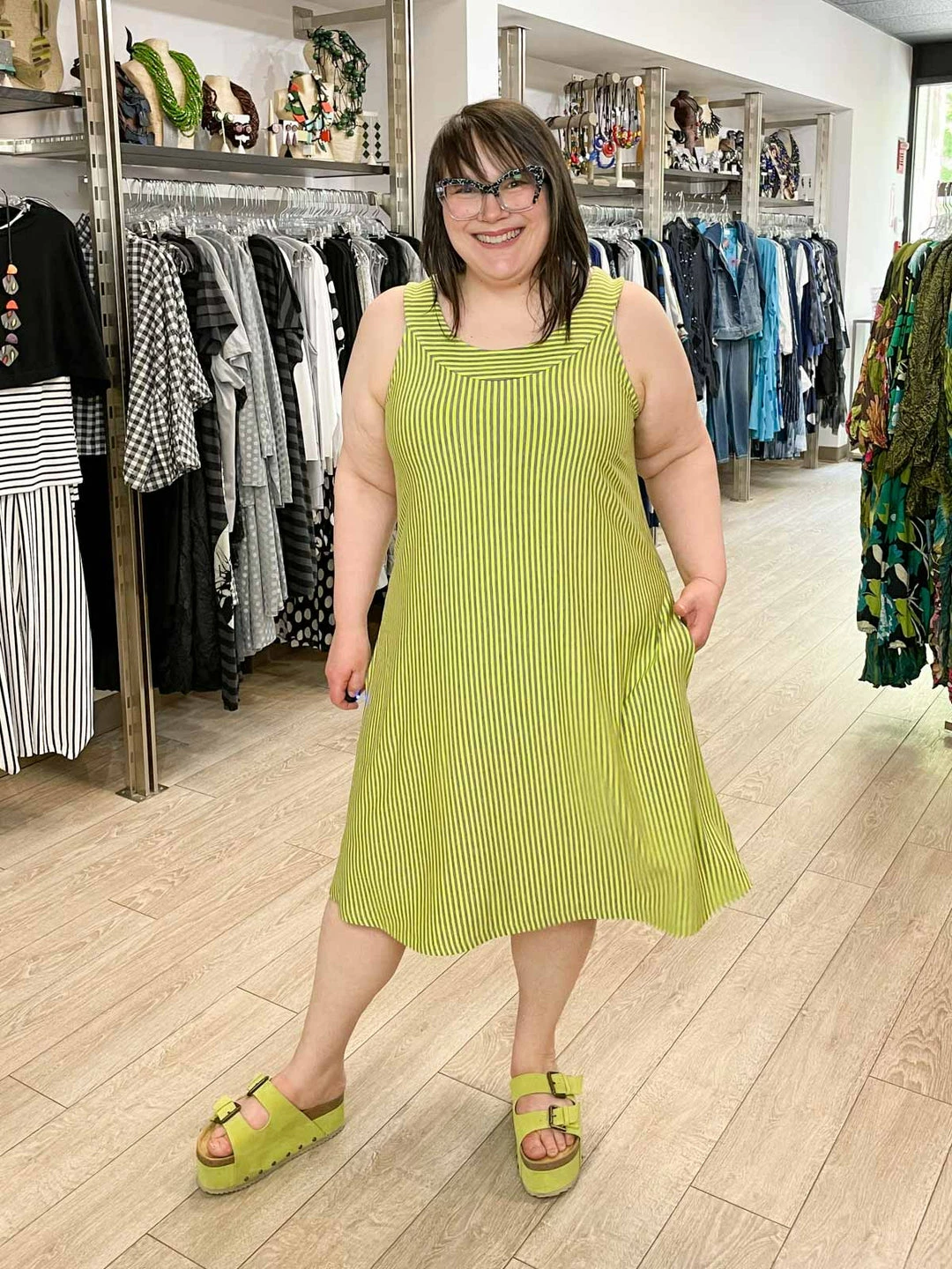 This easy a-line dress from Pure Essence features a flattering round neckline with bra-friendly straps. The swingy a-line silhouette hits at knee length, with side seam pockets.