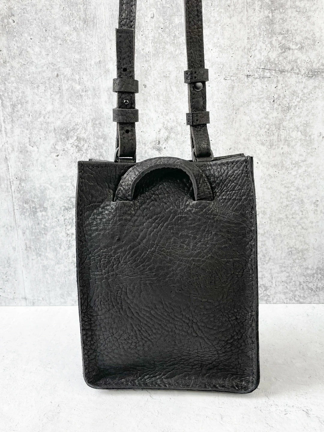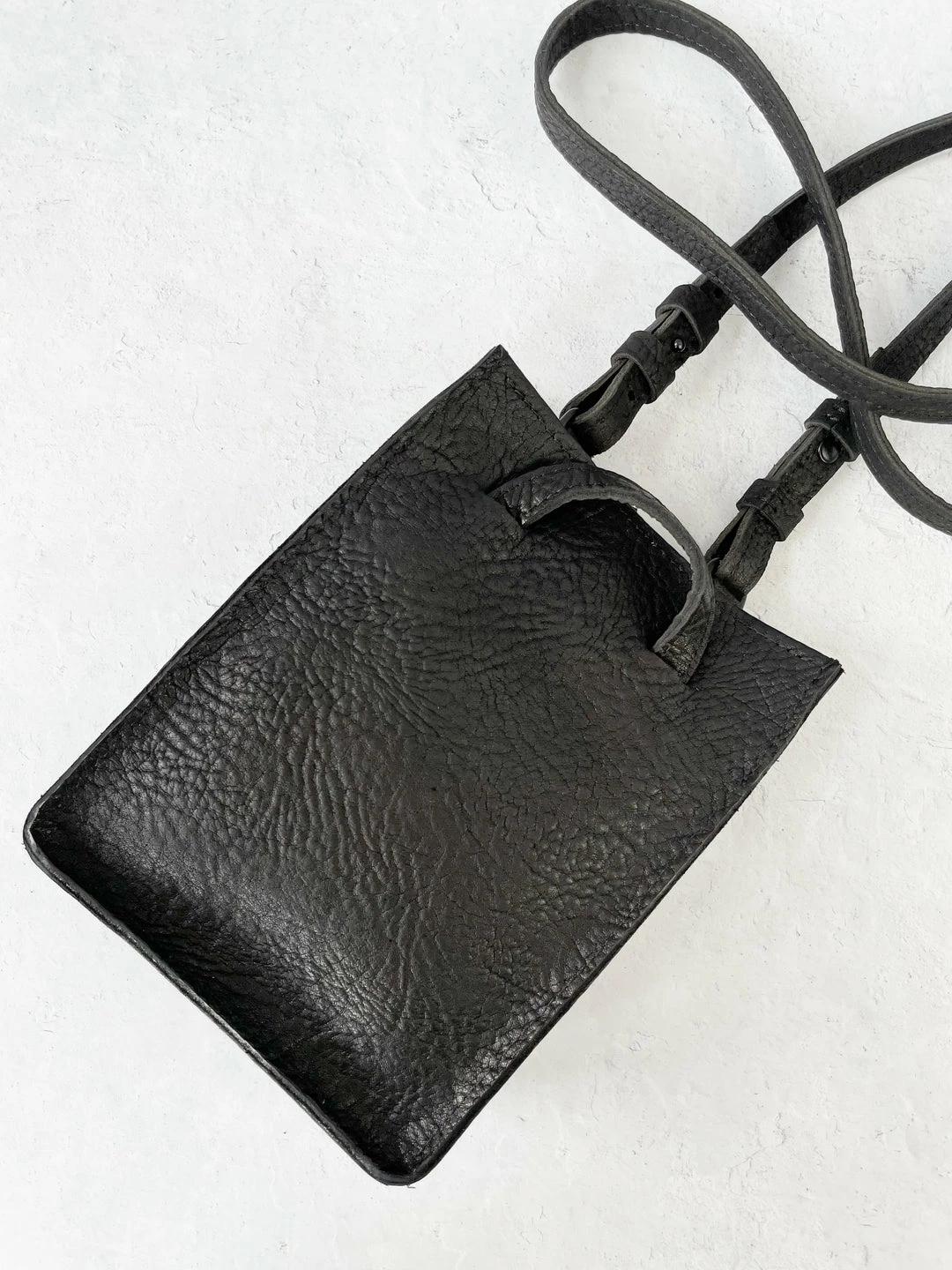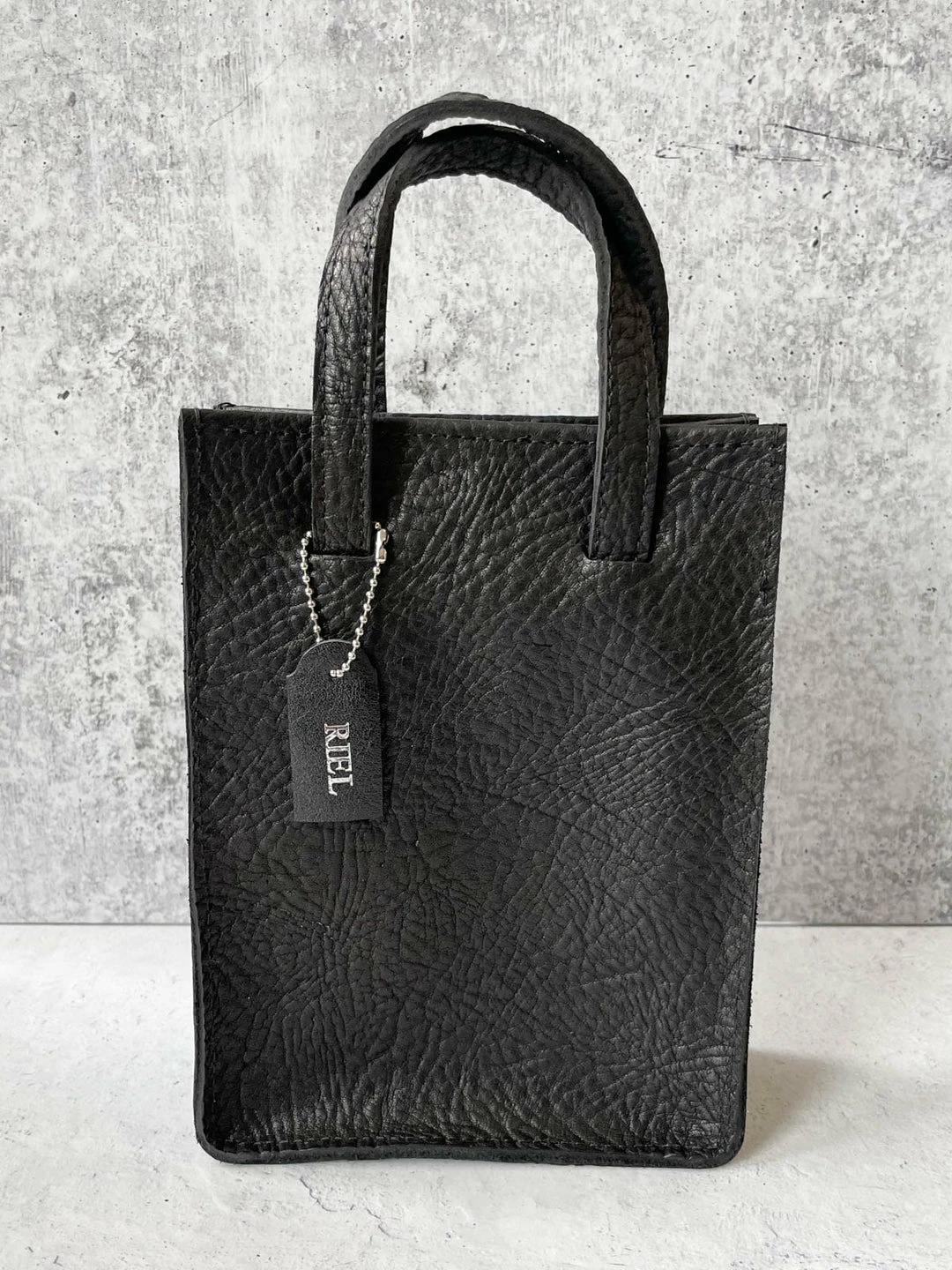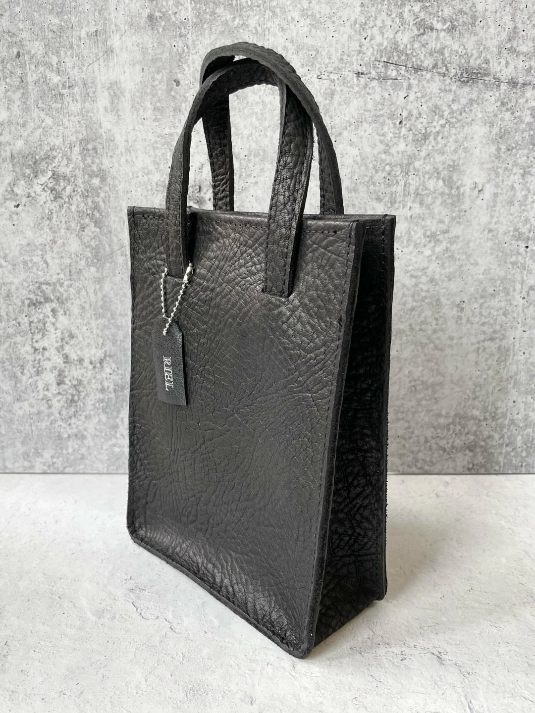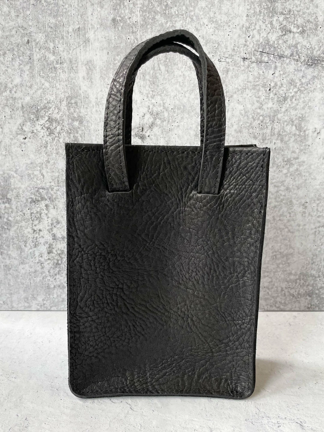This petite mini tote bag has a north-south rectangular silhouette with tote handles that can retract into the bag. A removable cross-body strap, lets you wear it hands free. Lined interior with snap closure.