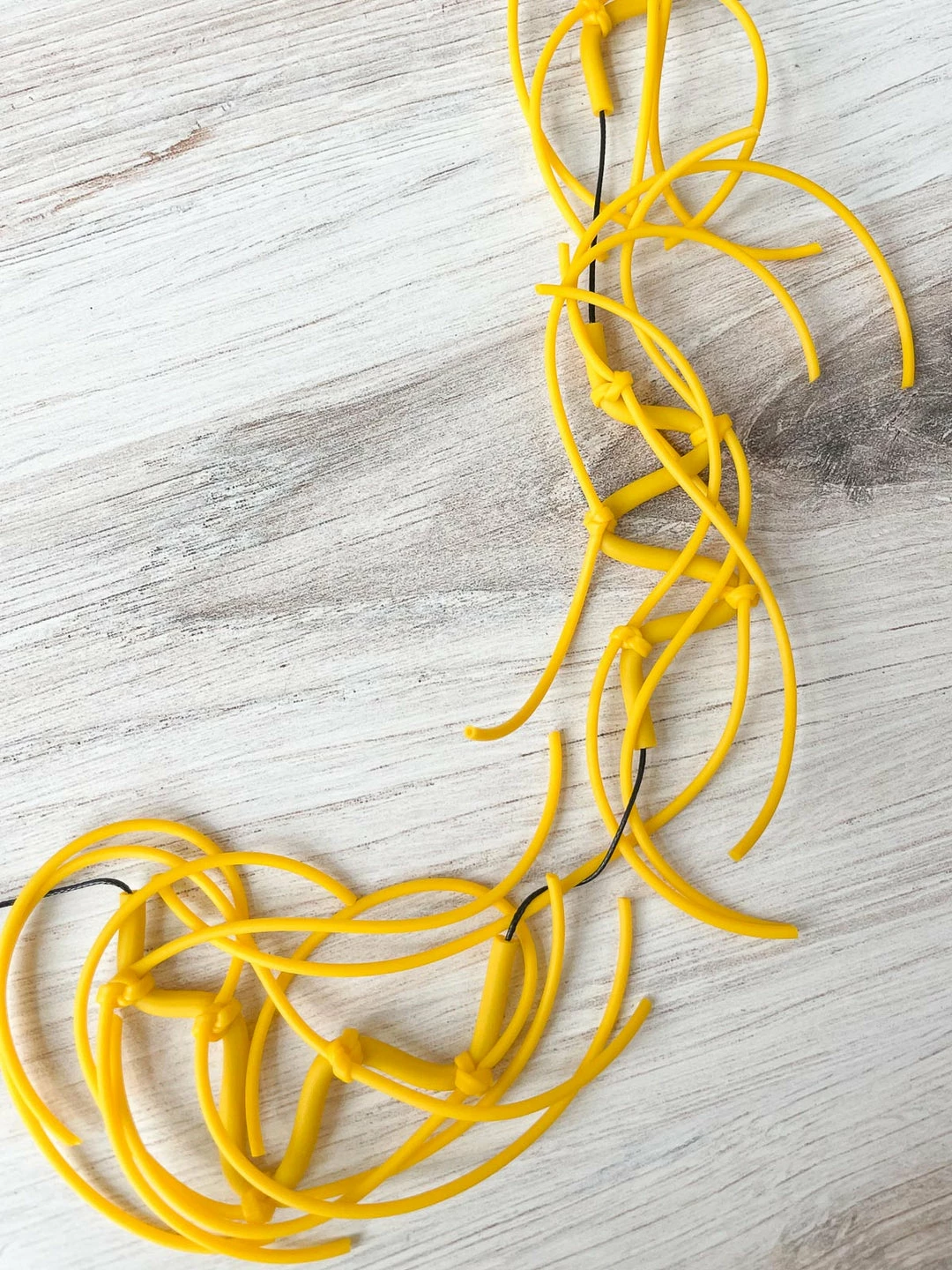 This lightweight piece is artful and fun with coordinating knotted rubber strands dotted along zig zag wired rubber cords on thin black threading.