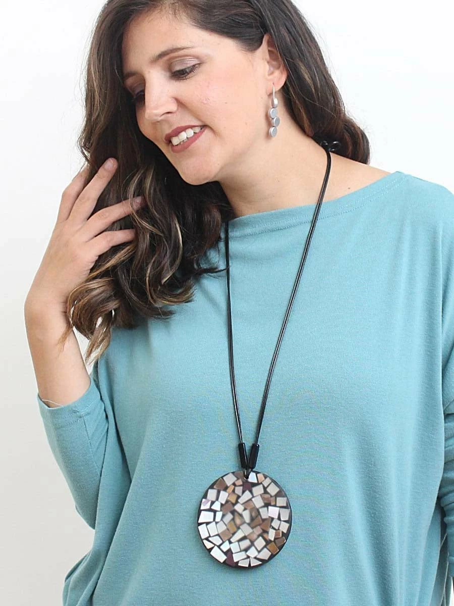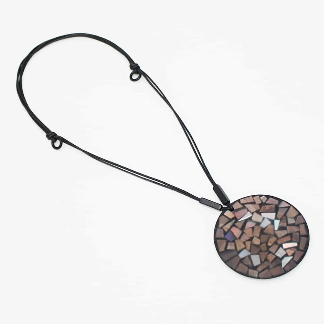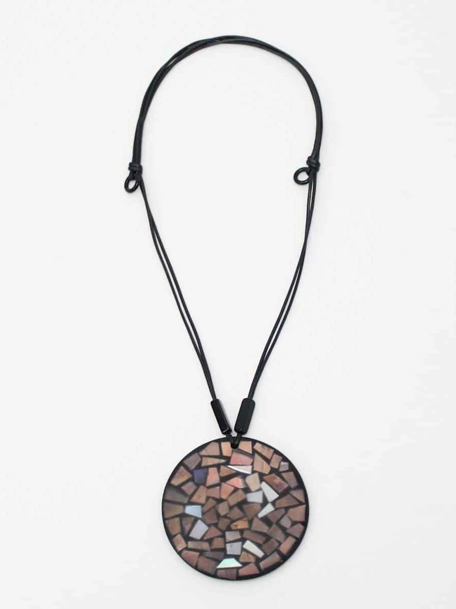 This beautiful pendant is like a piece of art. The large black resin pendant is decorated with a beautiful iridescent mosaic design. It might look heavy, but it is super lightweight and easy to wear. Hung from an adjustable black wax cord, this pendant will dress up that little black dress, or can simply pair with a tee and jeans.