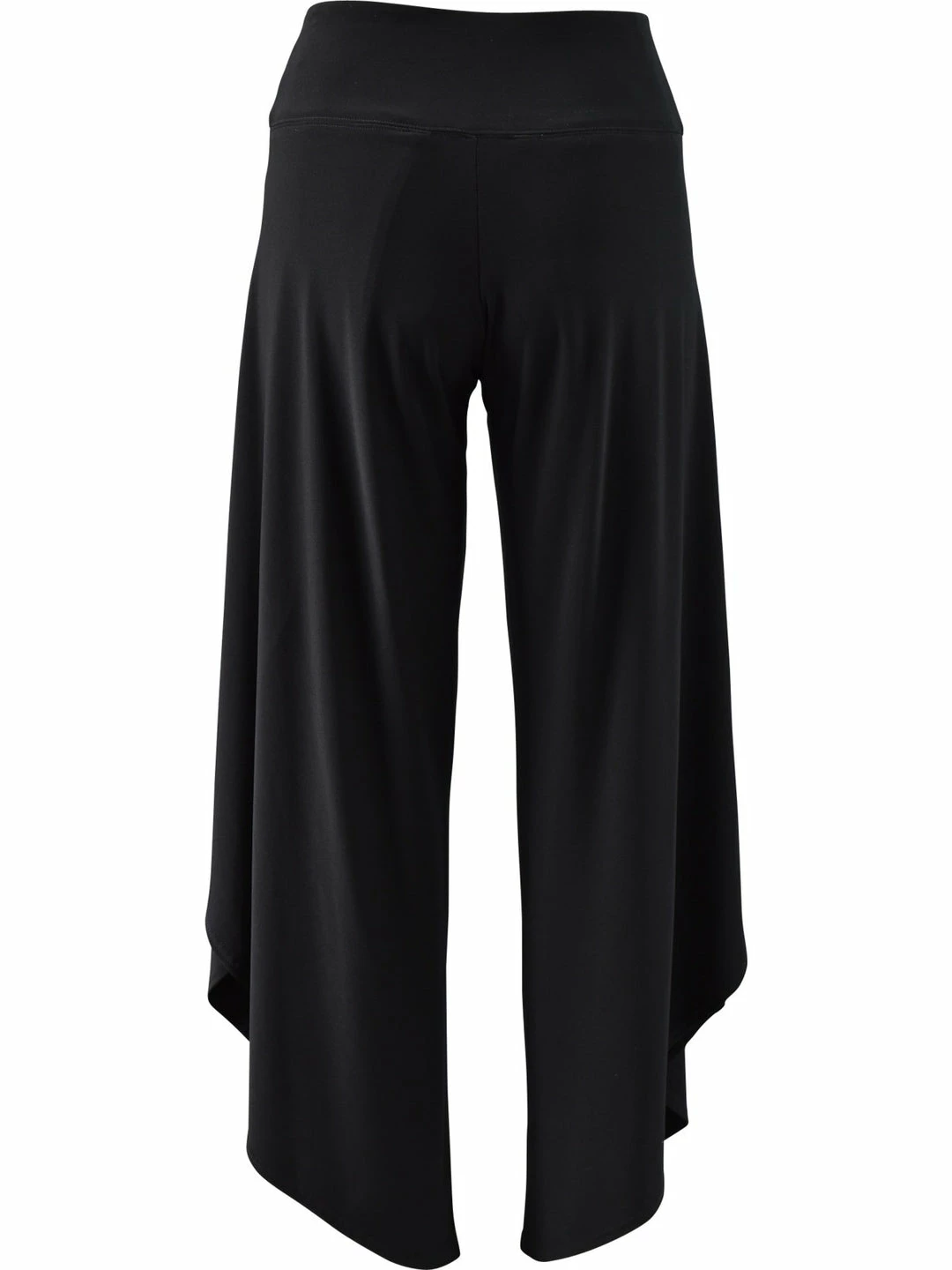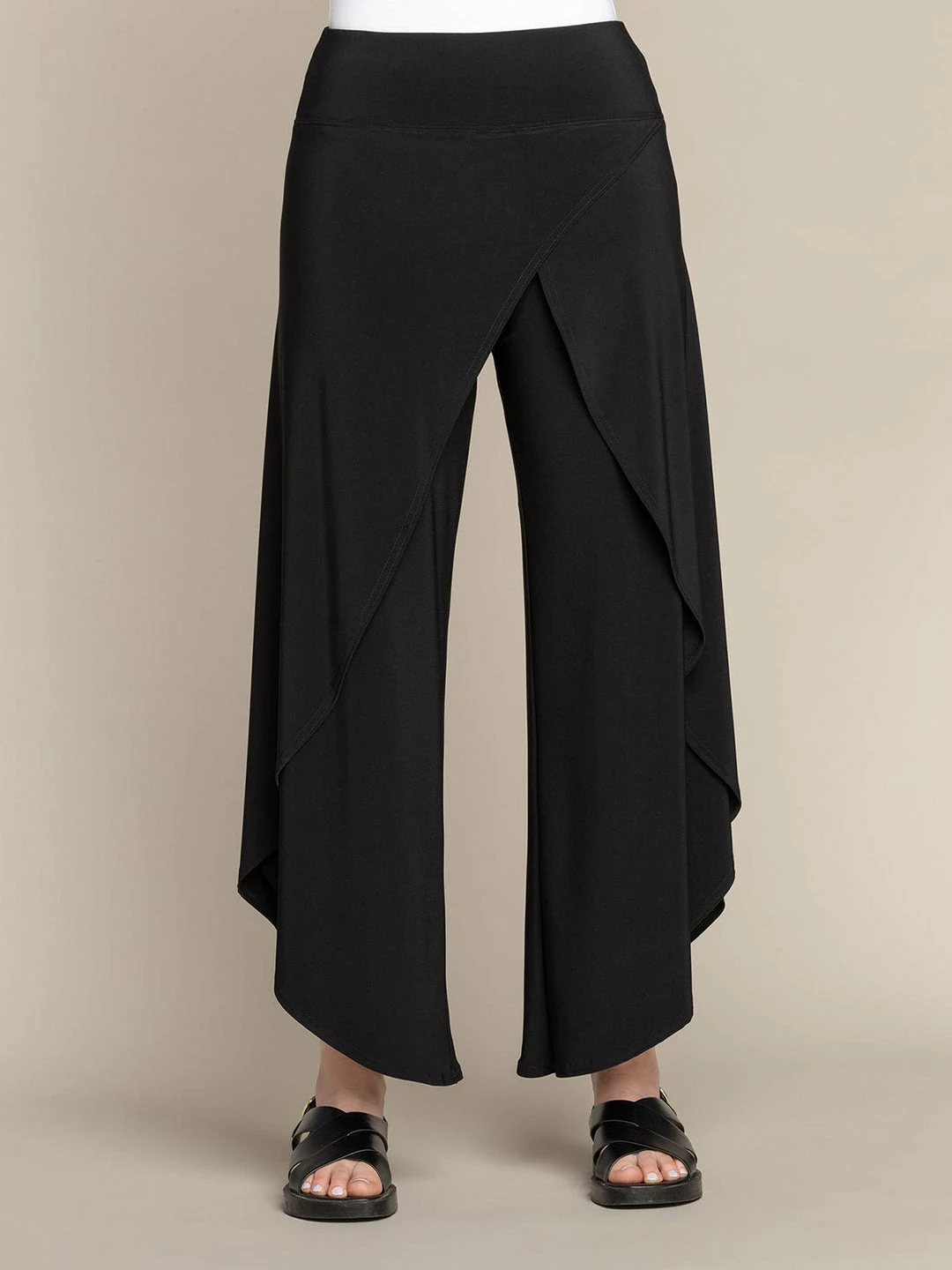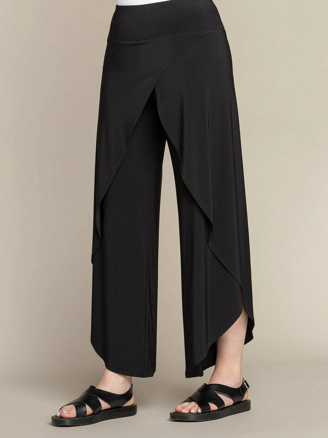 This flowy pant has a yoked waistband with front wrap detail. Cross over outer sides have a tulip look.
