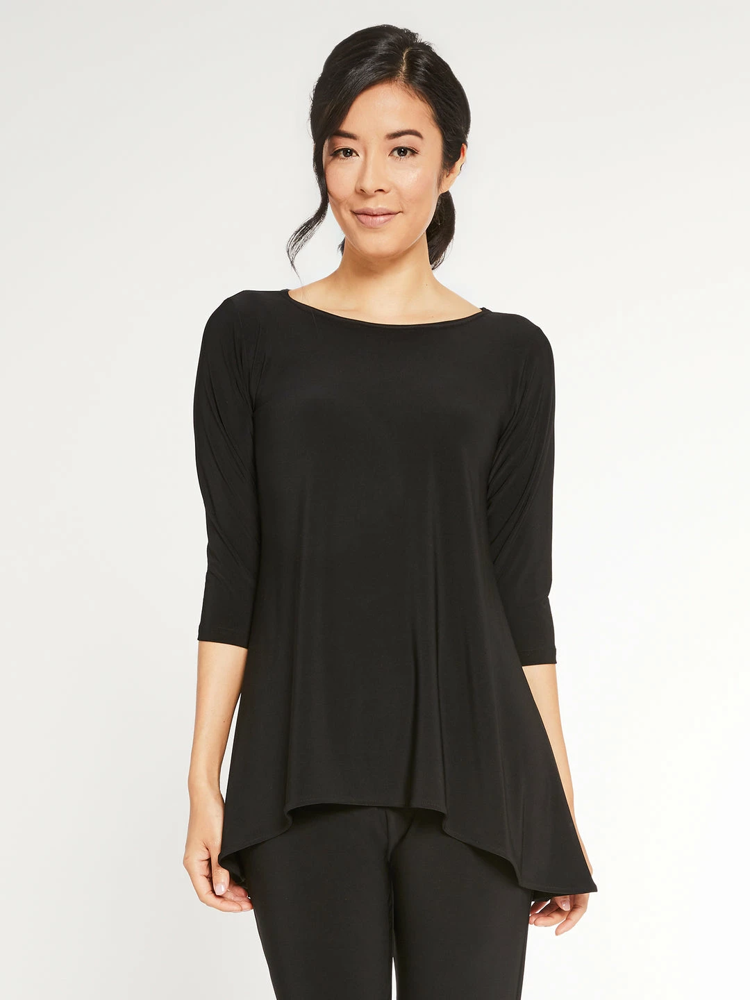 This Sympli essential features a high low hemline with an easy flared a-line body. Rounded boat neck with three quarter sleeves.