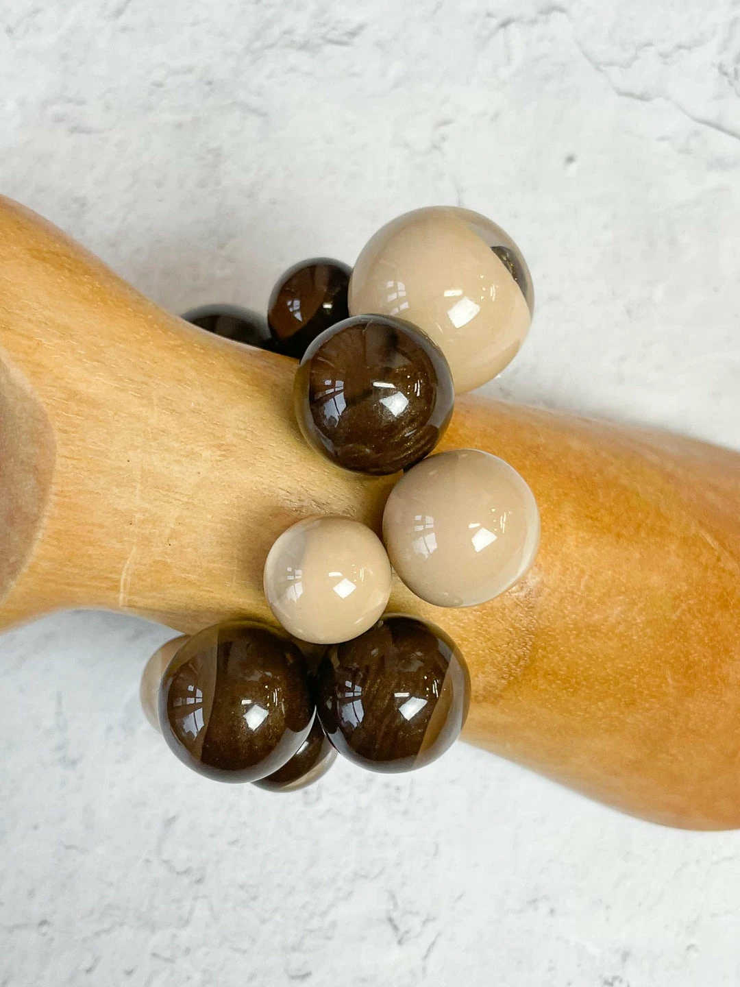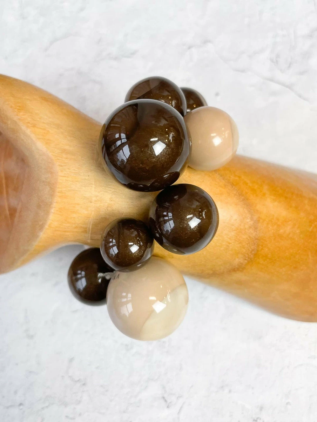Zsiska’s “Bolas” collection features two-tone spherical beads in various sizes. This stretch bracelet shows off a mix of round beads.