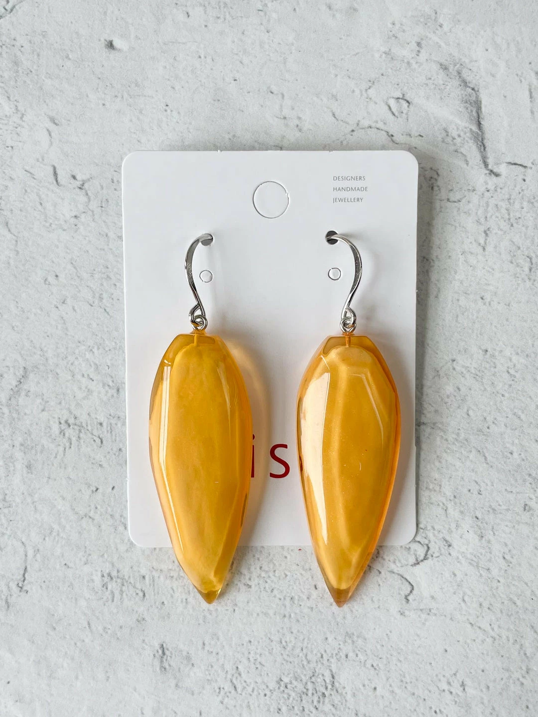 Part of Zsiska’s “Playa” collection, these chic drop earrings show off a faceted geometric shapes hanging from silver tone ear hooks. The high shine resin stands out with juicy translucent color layered over a cream base.