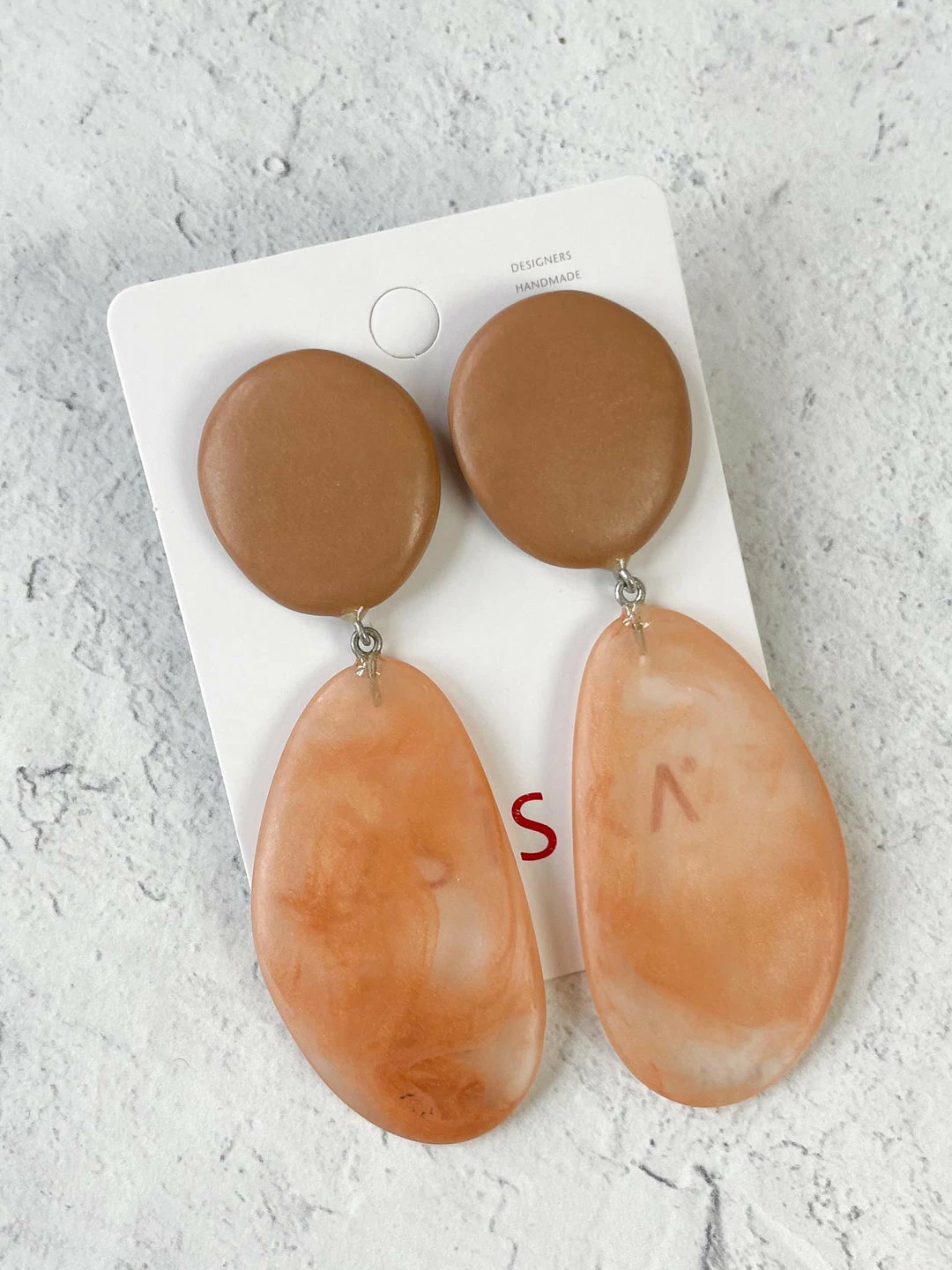 Zsiska’s “Sabaai” collection features a sophisticated mix of translucent marbled resin with coordinginat solid resin, both with a soft matte finish. These large drop earrings feature a pebbled shape bead on round post.